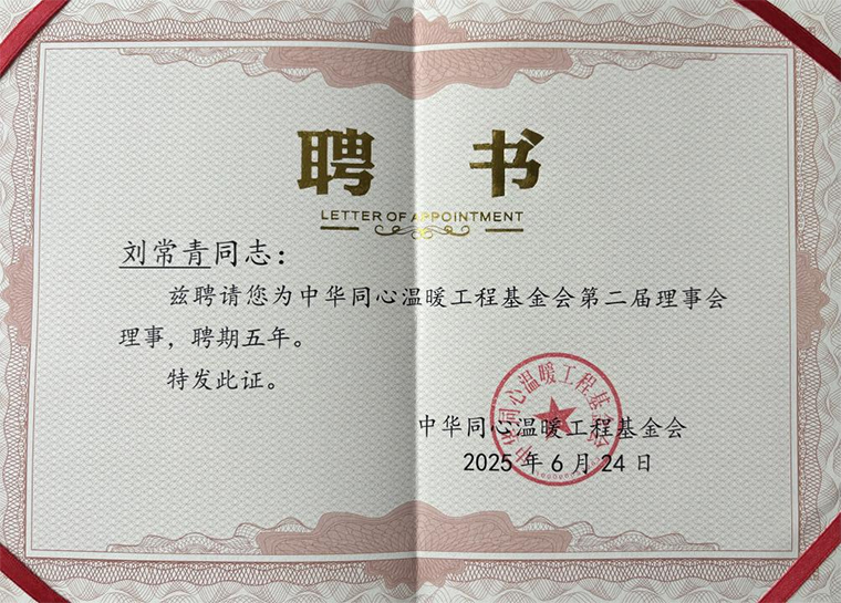 刘常青董事长当选中华同心温暖工程基金会第二届理事会理事