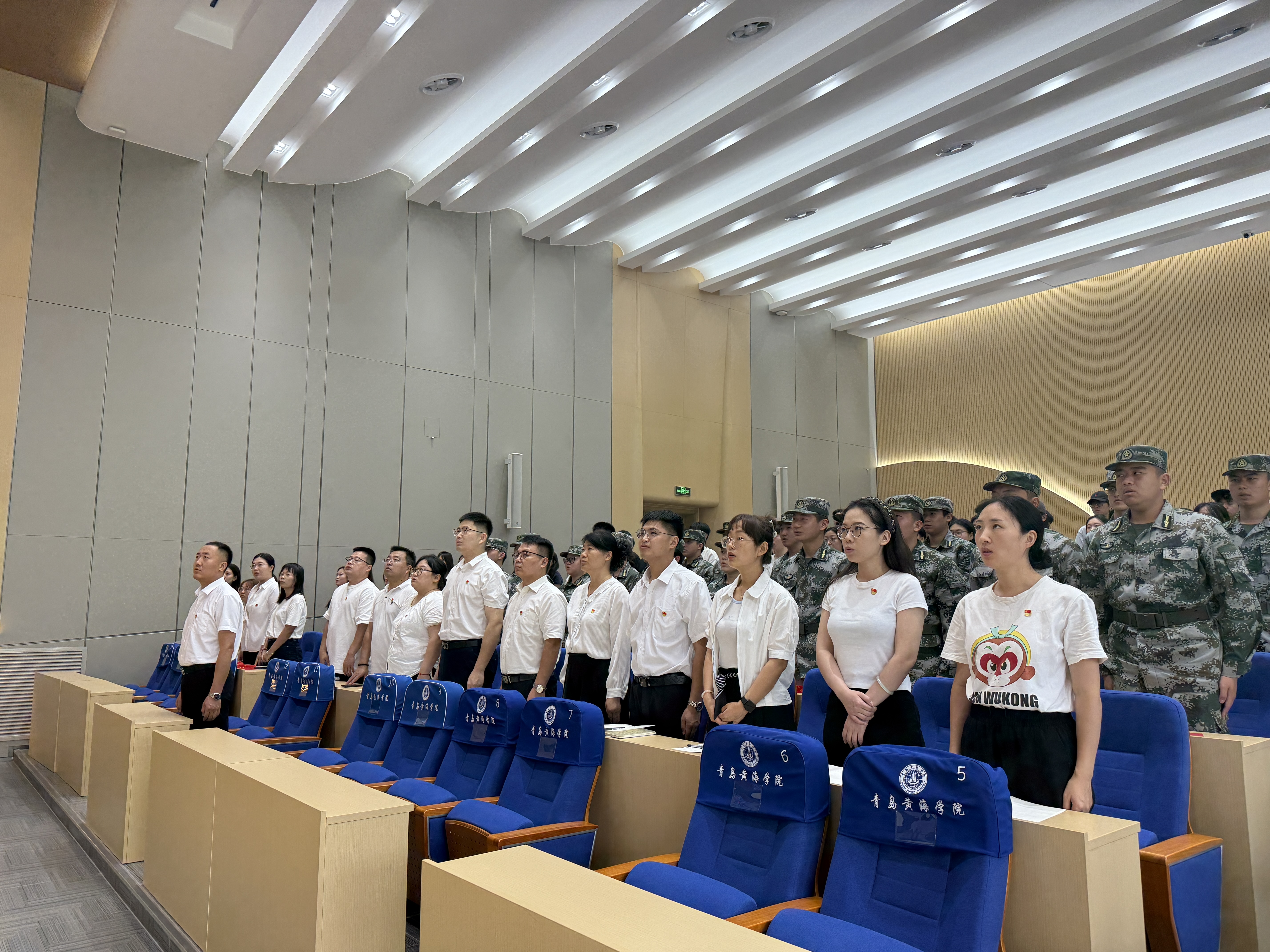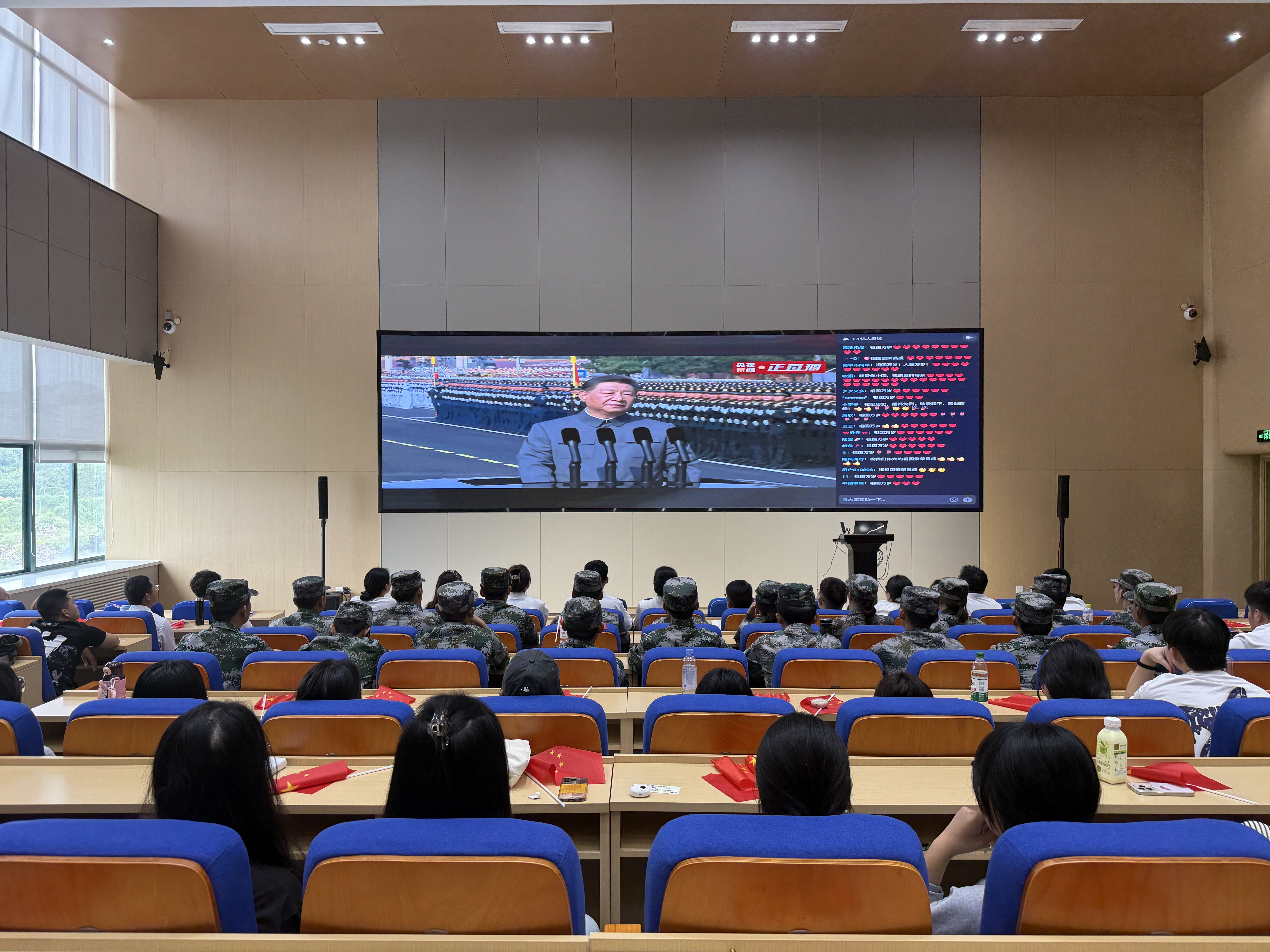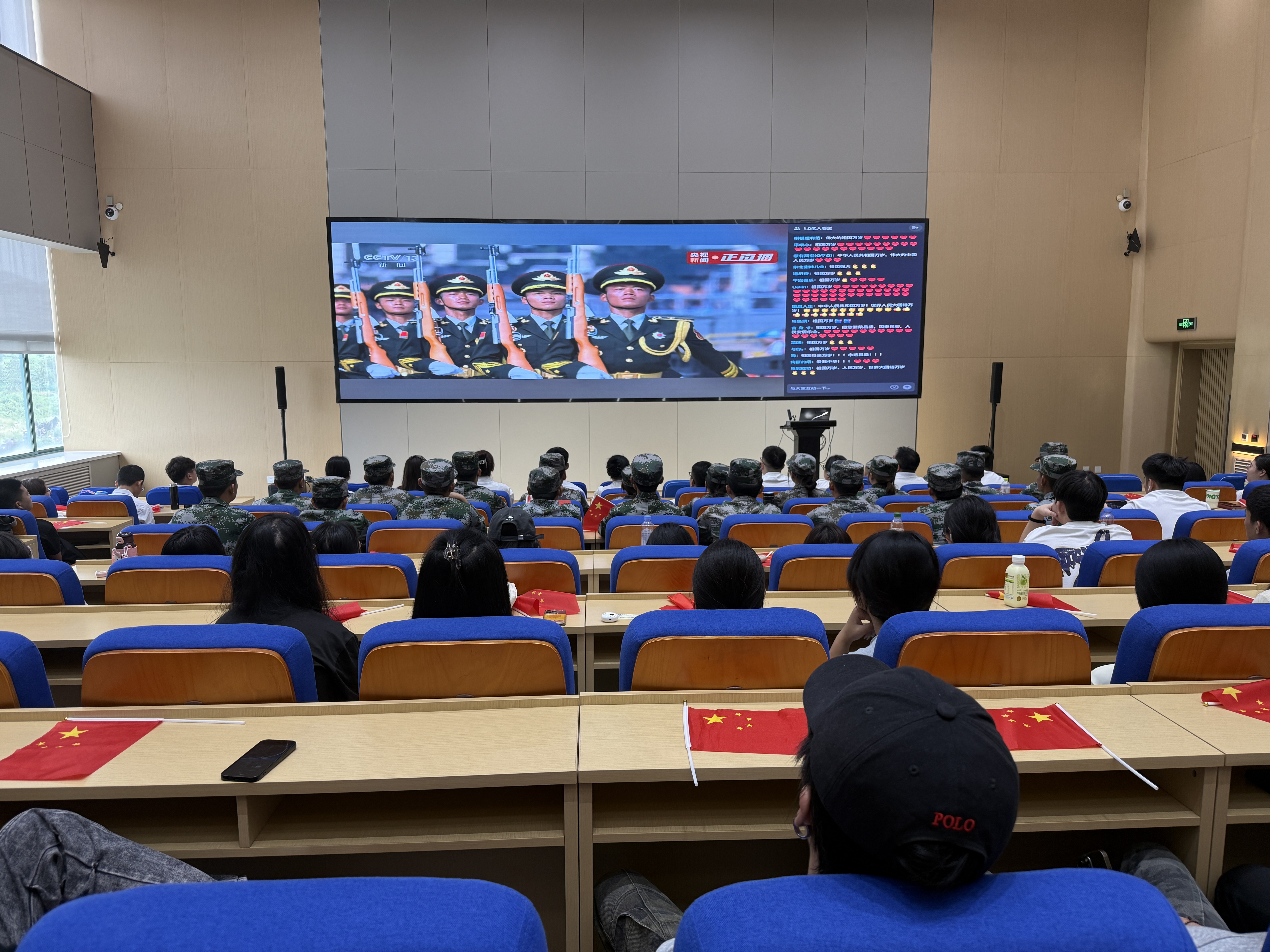 9月3日上午,纪念中国人民抗日战争暨世界反法西斯战争胜利80周年大会在北京天安门广场隆重举行,数字商务学院党总支组织全体教师代表、军训学生教官、学生代表在知行楼434报告厅共同观看了阅兵直播活动。