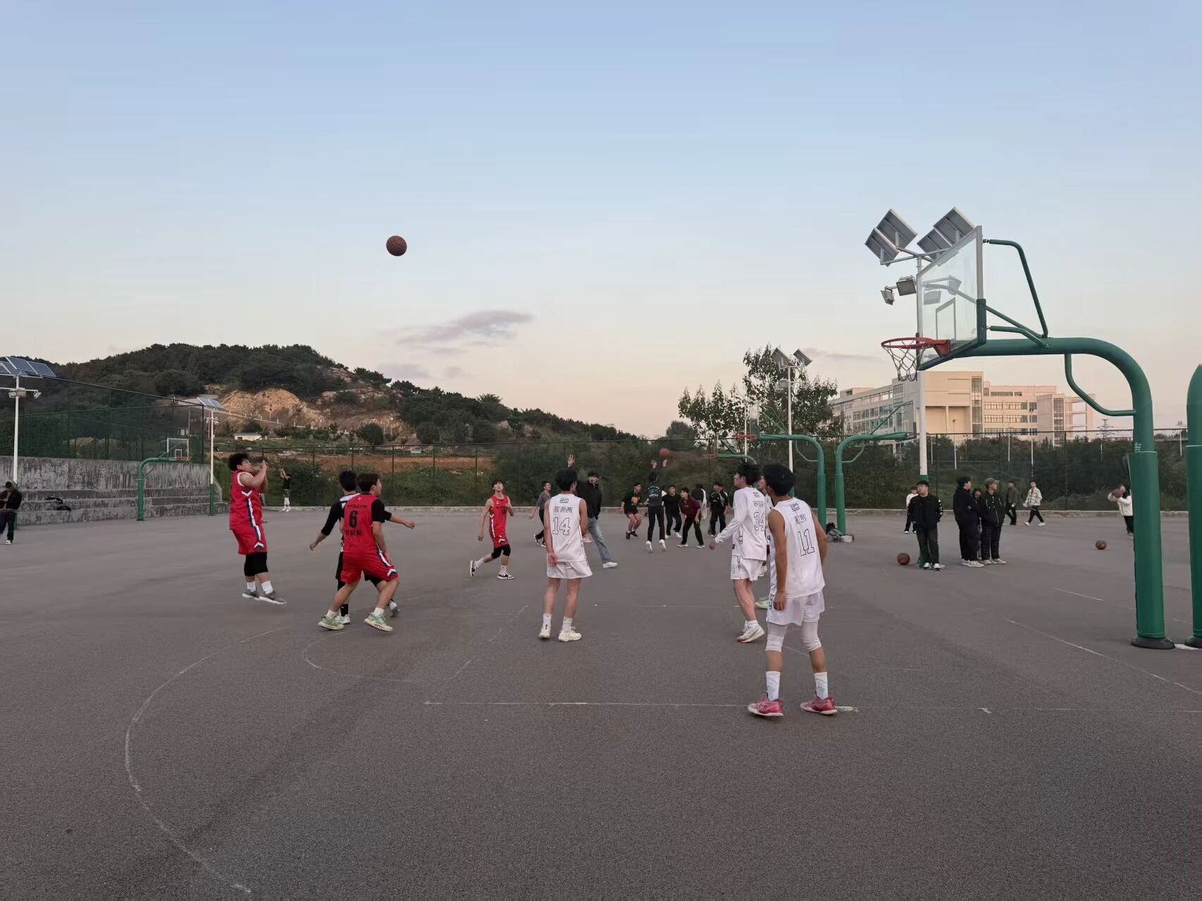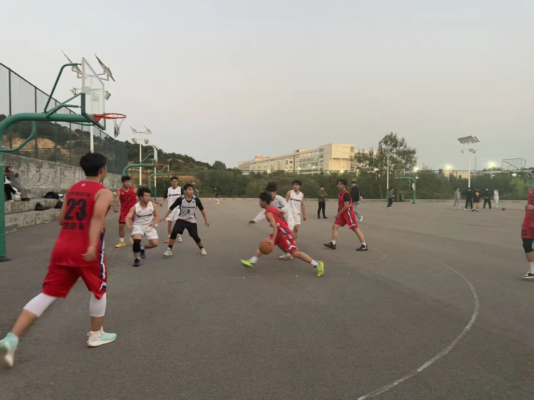 开场后,我校队员迅速进入状态。控球后凭借灵活的步伐突破防线,一个精准传球给到内线。9号球员不负众望,转身跳投,篮球在空中划出一道优美的弧线,稳稳落入篮筐。“好球!”看台上立刻爆发出雷鸣般的掌声。邻校队员也不甘示弱,发起猛烈反攻,但是被我方队员防守下来,双方陷入胶着。