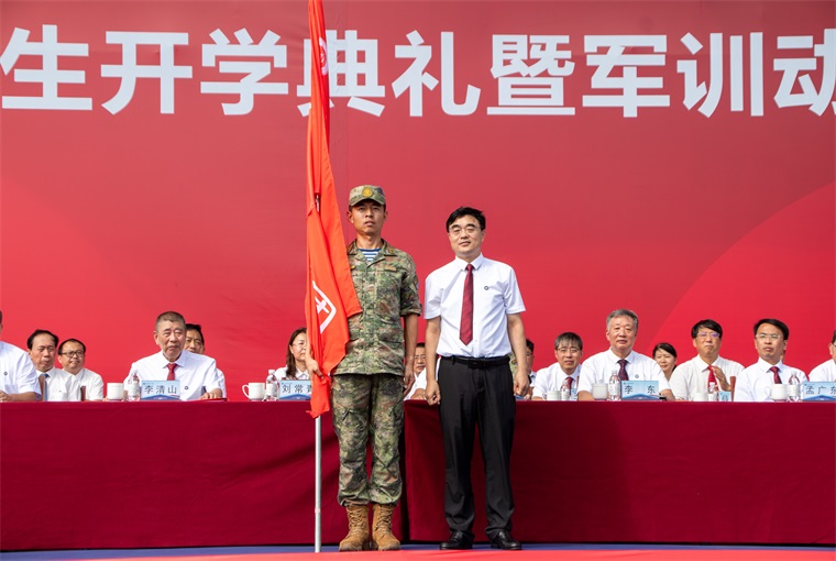 青岛黄海学院董事长刘常青为2025级新生军训团授旗。