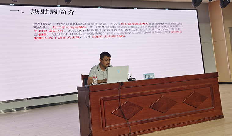 赵连兴医师毕业于首都医科大学,获急诊医学全日制博士学位,现任山东省抗癌协会肿瘤重症青委会副主任委员、省医学会急诊医学分会重症组委员等多个专业职务,在急危重症救治领域具有丰富临床经验和科研背景,发表多篇学术论文,其中SCI论文7篇。培训内容围绕“热射病”与“过度通气综合征”两大主题展开。赵医师系统介绍了热射病的发病机制、多脏器损伤风险、预防措施及现场急救方法,强调早期识别和快速降温的重要性。同时,针对军训期间可能因情绪紧张、呼吸节奏紊乱引发的“呼吸性碱中毒”(即过度通气综合征),他详细讲解了其预防与应急处置方式。