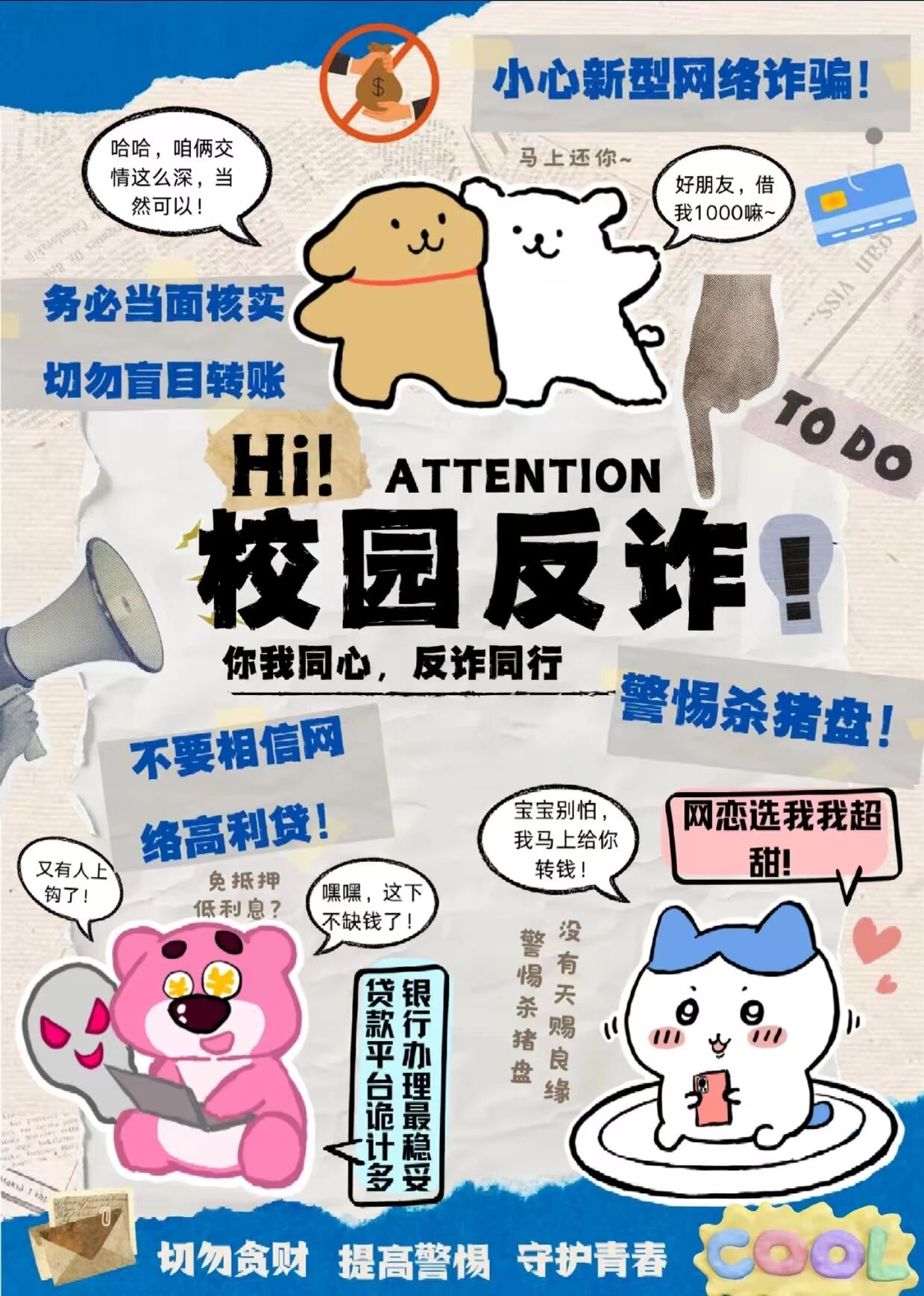 2. 警惕“刷单返利”“中奖兑换”“校园贷”“冒充客服退款”等常见骗局,坚信“天上不会掉馅饼”。