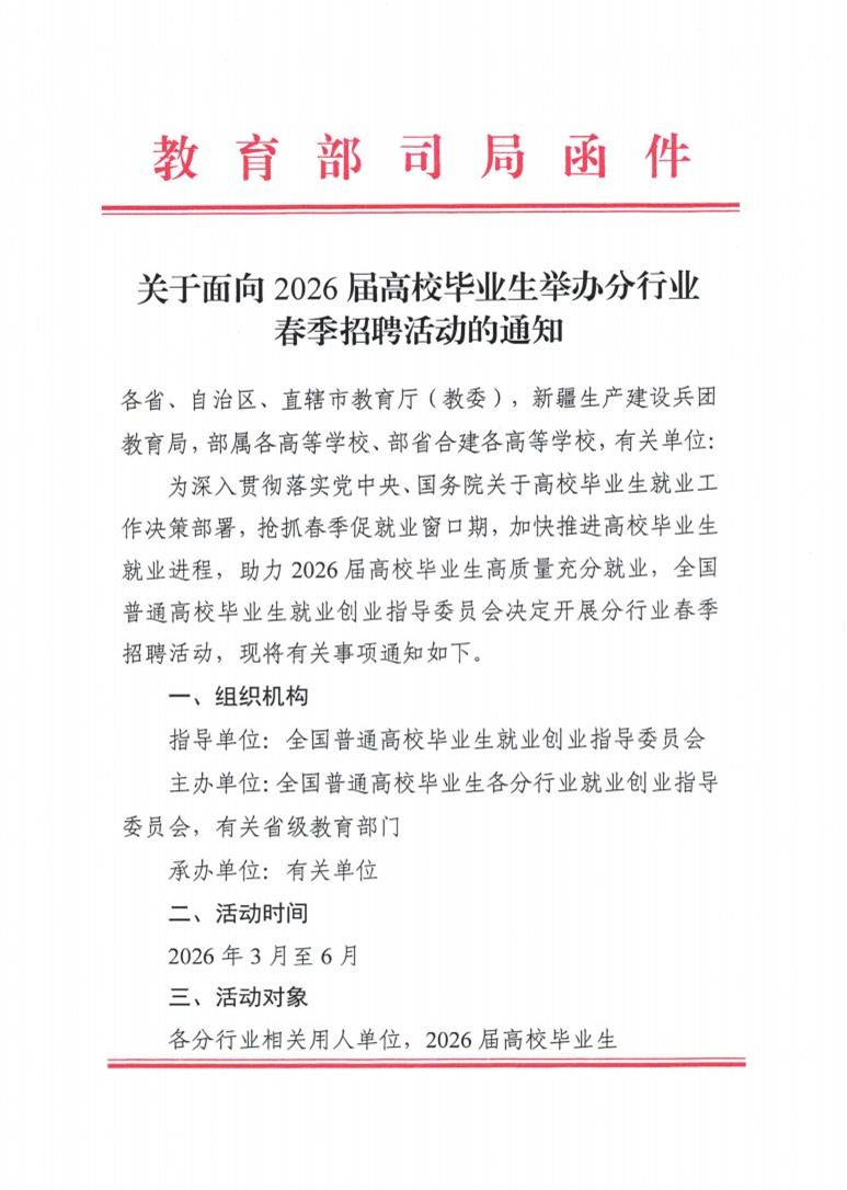 关于面向2026届高校毕业生举办分行业春季招聘活动的通知