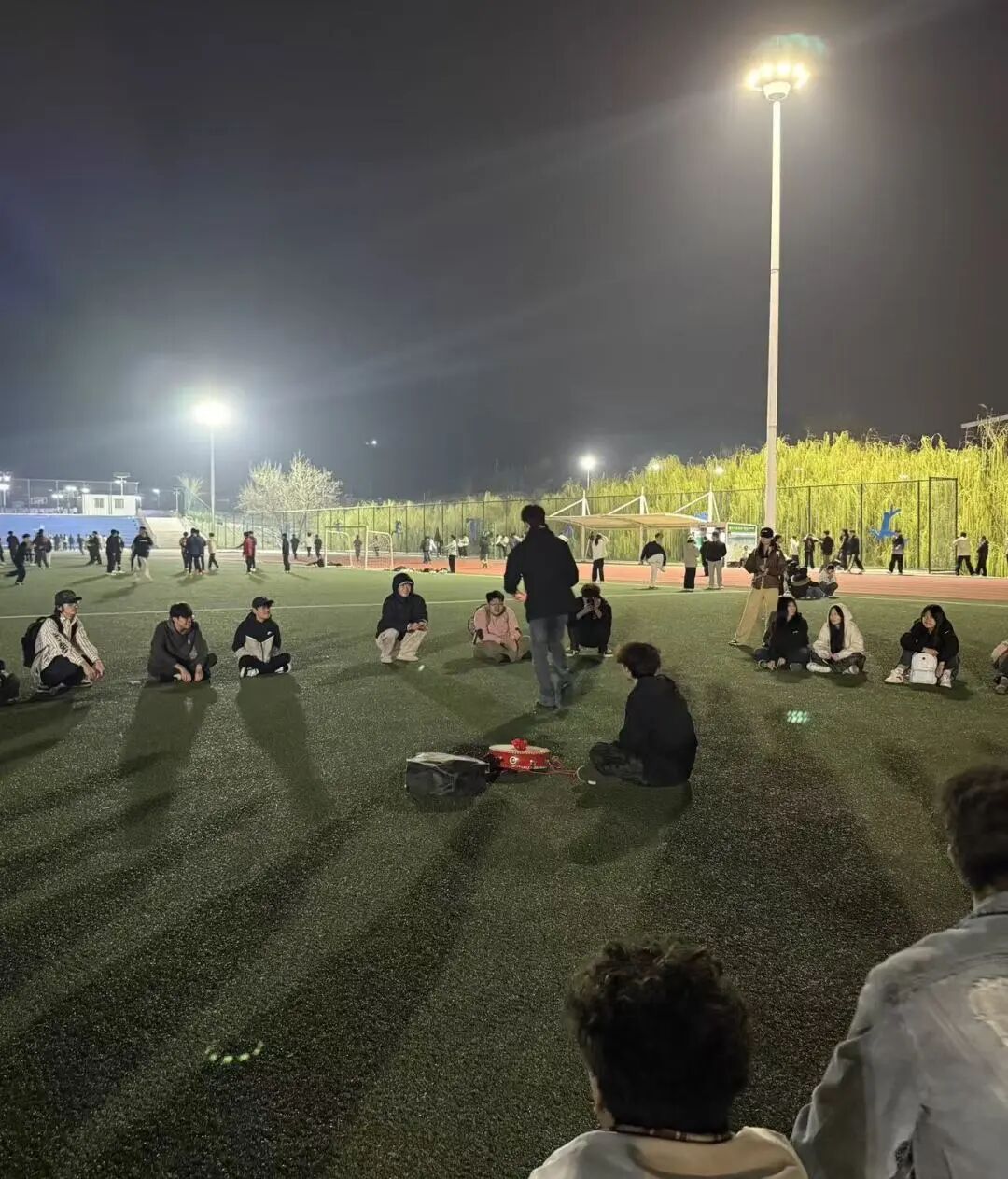 夜幕降临,华灯初上,操场灯光璀璨,绿茵场地在夜色中格外温馨。活动开始前,同学们便陆续从教室、宿舍结伴抵达现场,满怀期待地等候活动开启。随着活动正式启动,现场氛围迅速热烈起来,有学生主动牵头带动互动节奏,全体人员跟着节拍拍手欢笑,其乐融融;部分学生自发组织趣味小游戏,在协作配合中增进交流、拉近彼此距离。跑道上,不少同学结伴慢跑、悠闲漫步,迎着晚风舒展身体,卸下学习与生活的压力。大家告别了书桌前的久坐、告别了宿舍里的慵懒,在开阔的操场上舒展身体、释放情绪,每一个奔跑的身影、每一张灿烂的笑脸,都勾勒出青春最鲜活的模样。大家暂时放下了书本与电子设备,在开阔的操场上舒展身体、交流心声,尽情享受着集体活动的快乐。