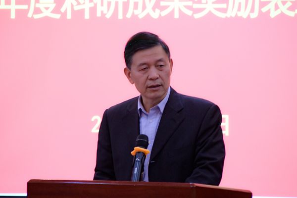 王渊明校长在会上讲话。他对学校2018年的科研工作成绩进行了总结和回顾,向受表彰的教师致以祝贺和感谢,对进一步促进我校科研工作提出五点要求:充分发挥科研引领作用,加强学科和团队建设,深化协同创新科研体制改革,加强科研平台建设,积极拓展社会服务。希望大家勇于担当、勤奋工作,努力学习、钻研理论,锐意改革、大胆实践,积极进取、敢为人先,拿出更多的科研成果,为学校的发展做出新的贡献。