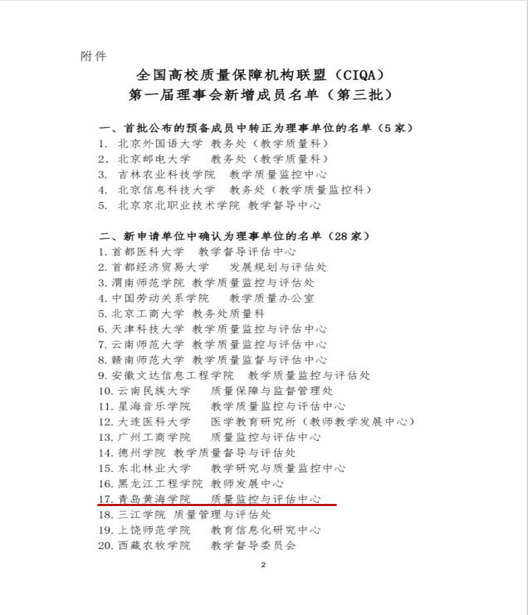 9月6日,全国高校质量保障机构联盟(CIQA)公布《第一届理事会新增成员名单(第三批)》(全高质盟[2021]3号),我校成为理事单位。