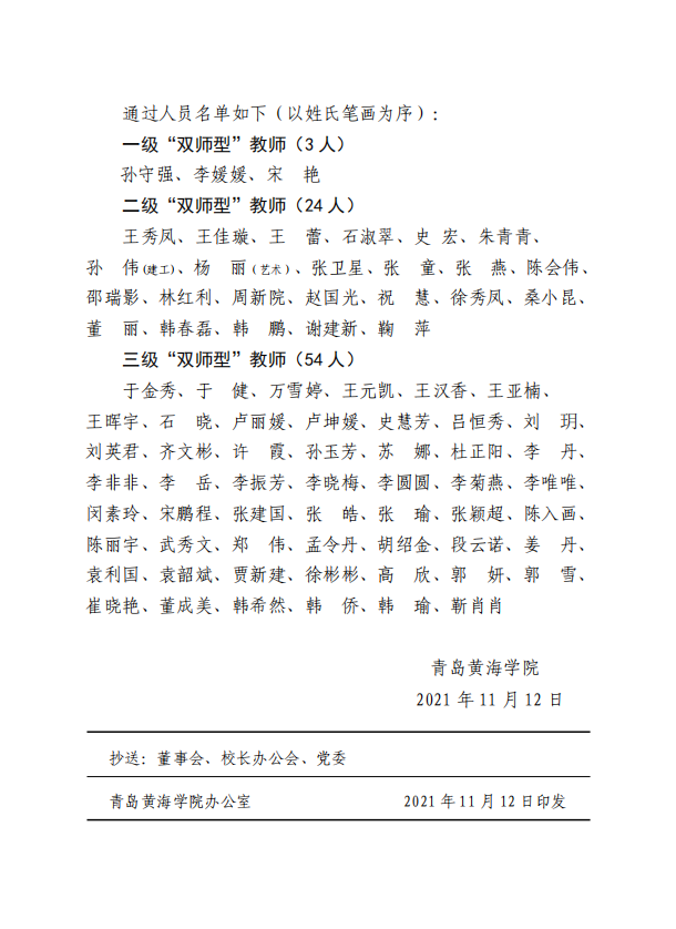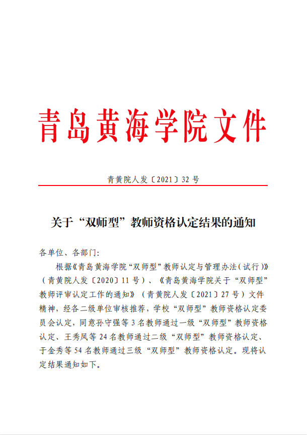 青岛黄海学院关于“双师型”教师资格结果的通知