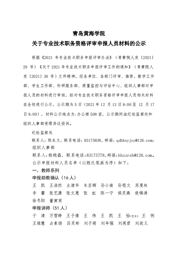 青岛黄海学院关于专业技术职务资格评审申报人员材料的公示