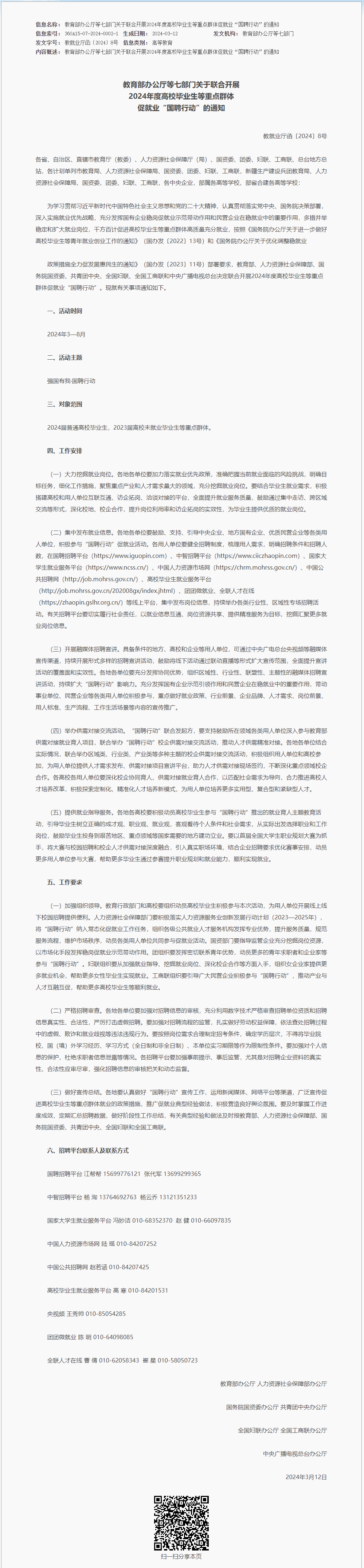 教育部办公厅等七部门关于联合开展2024年度高校毕业生等重点群体促就业“国聘行动”的通知