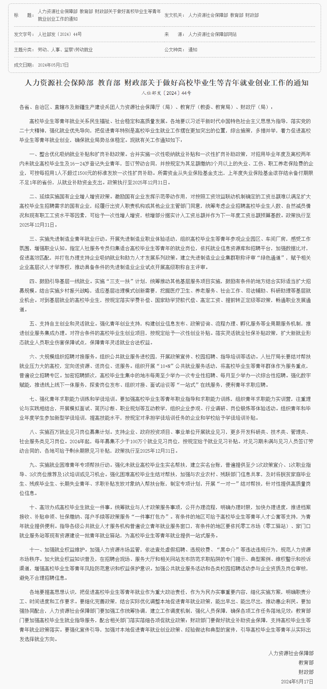 人力资源社会保障部 教育部 财政部关于做好高校毕业生等青年就业创业工作的通知