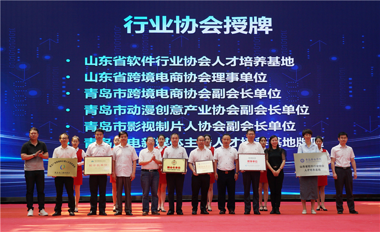 揭牌仪式上,山东省软件行业协会秘书长刘灿军为黄海学院授予山东省软件行业协会人才培养基地牌匾;山东省跨境电商协会秘书长吕亚萍为黄海学院授予理事单位牌匾;青岛市跨境电商协会副会长盖泽波为黄海学院授予副会长单位牌匾;青岛市动漫创意产业协会会长刘毓琮为黄海学院授予副会长单位牌匾;青岛市影视制片人协会会长贺志宝为黄海学院授予副会长单位牌匾;青岛广电文创中心项目运营副总监李思璁为黄海学院授予青岛广电新媒体主播人才培养基地牌匾。学校也为行业企业专家颁发了聘书。