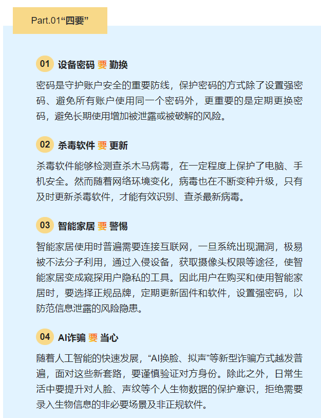 随着互联网科技发展的日新月异,网络在推动社会经济发展、为人民生活带来便利的同时,也引发了信息泄露、隐私侵犯、电信诈骗等诸多社会问题,给广大人民群众的人身和财产安全埋下了隐患。“保密观”总结了日常生活中守护网络安全的“四要”“四不要”,帮您防范化解风险隐患。