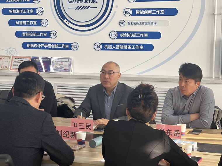 刘纪新首先对卫三民一行的到来表示热烈欢迎,介绍了青岛黄海学院发展概况及人才培养特色与成效,重点交流了智能制造学院专业集群建设、科研团队平台建设、创新人才培养等方面的情况。他对华夏天信公司多年来对学校学院发展的大力支持表示衷心感谢,并表示一定发挥好公司给予的产业资源,以山东省智能制造现代产业学院人才培养、新能源智能装备实训基地建设工作为基础,推动双方高层次人才双聘双跨、科技创新、科教融汇的深度合作,助力双方共同发展。