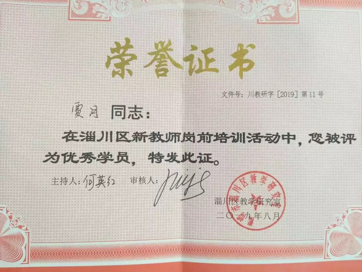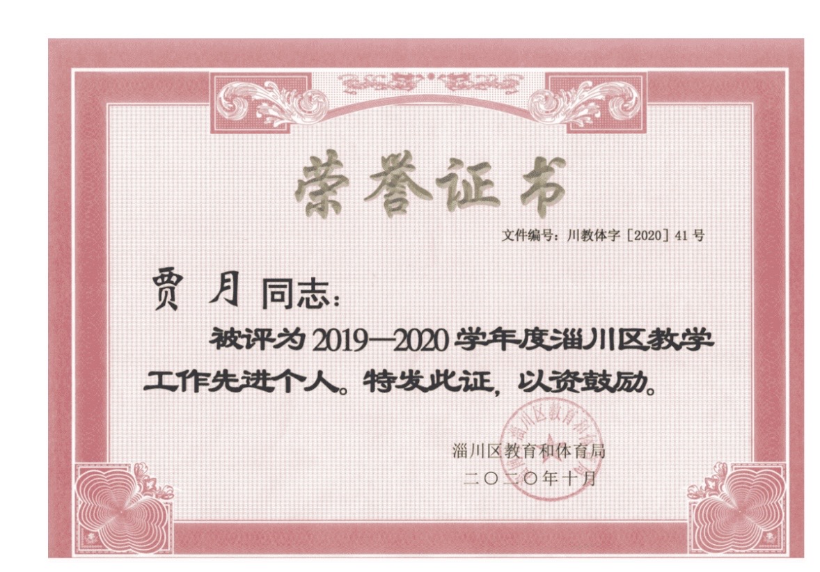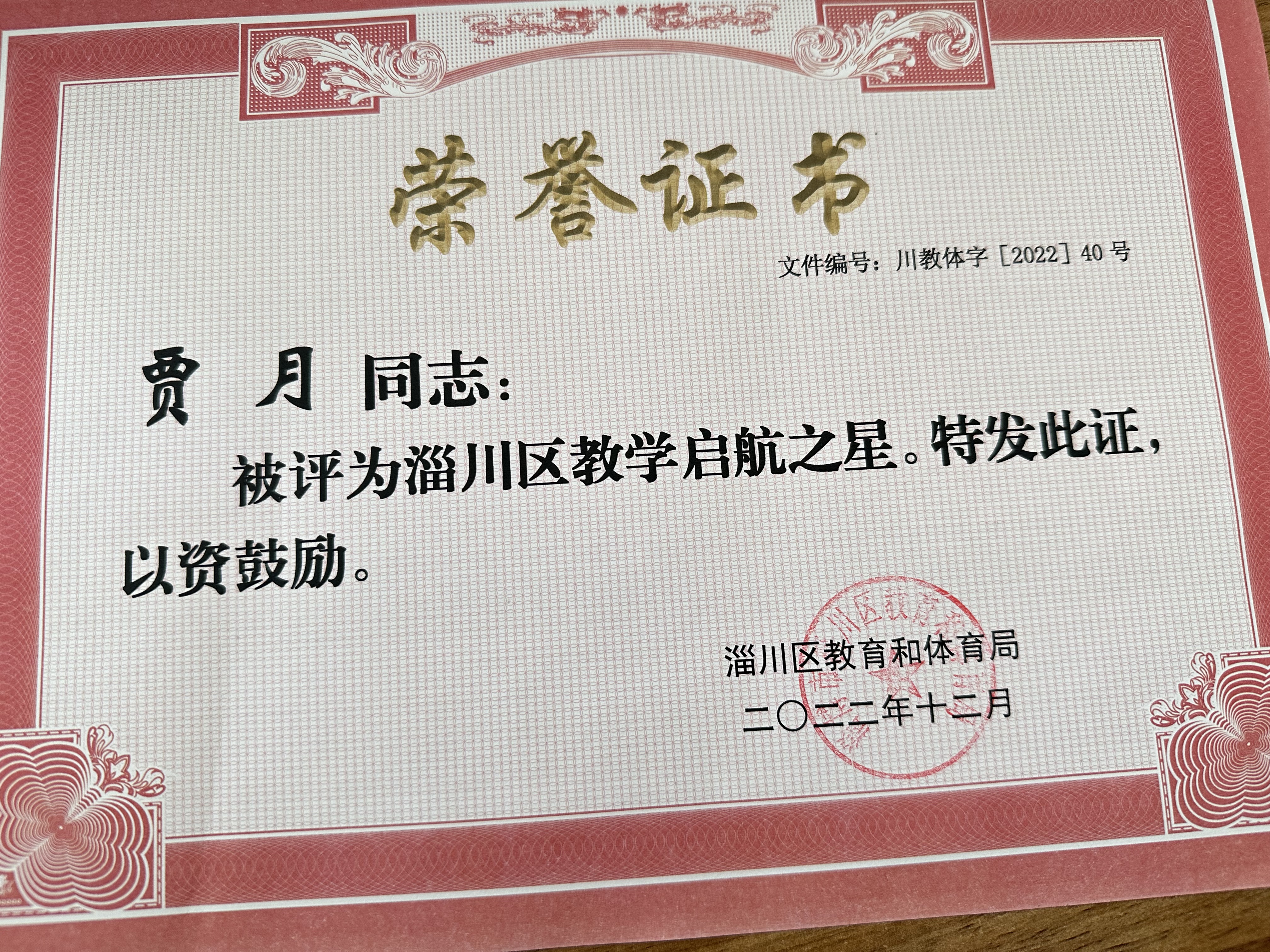 现已她从事教师工作五年有余,从最初的在讲台上的忐忑不安到现在的慢慢成熟,有遭受挫折的沮丧,也有小小胜出的欣喜,但无论时光如何流转,唯一不变的是她教书育人的初心。她从教第一年就获得淄川区教学先进个人,期间还获得淄川区教学启航之星、淄川区教体系统表现突出个人,淄川区优秀班主任等荣誉。因为热爱,她成绩优异,熠熠生辉。