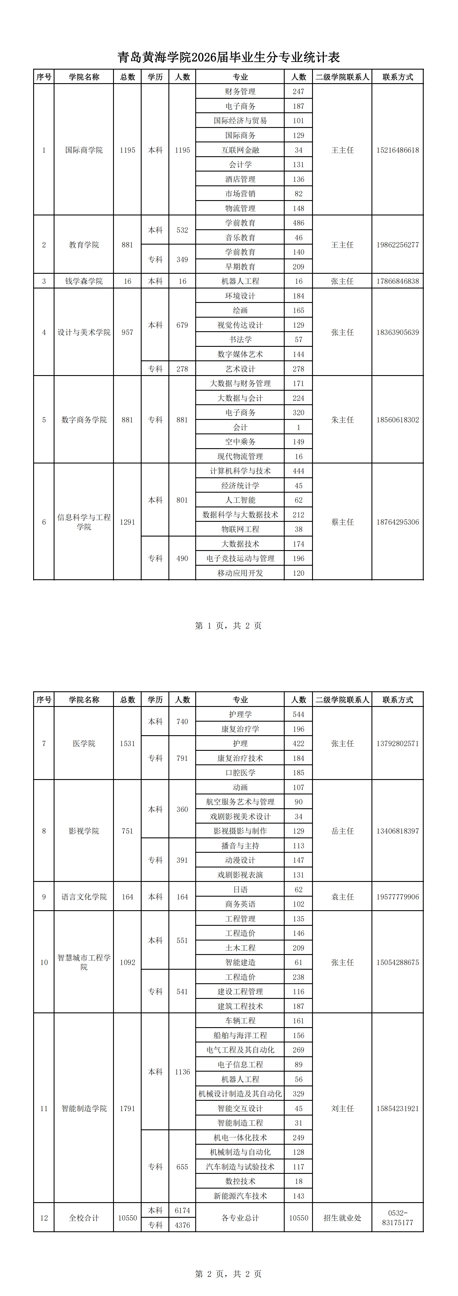 青岛黄海学院2026届毕业生专业培养情况统计表