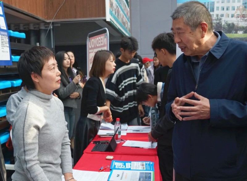 招聘会现场,校长李清山、党委书记李东、副校长刘纪新等学校领导与学生和企业面对面交流,询问招聘岗位、毕业生简历投递等情况,了解人才招聘需求和建议。