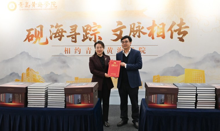 青岛黄海学院也以书为媒,向西海岸新区文化和旅游局捐赠书籍,用实际行动助力地方文化事业发展,西海岸新区政协副主席、区文化和旅游局党组书记、局长薛立群为学校颁发接收证书。
