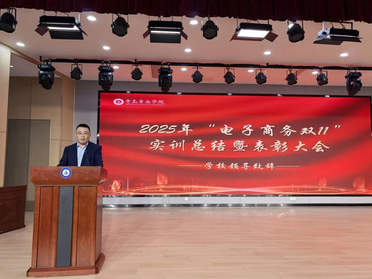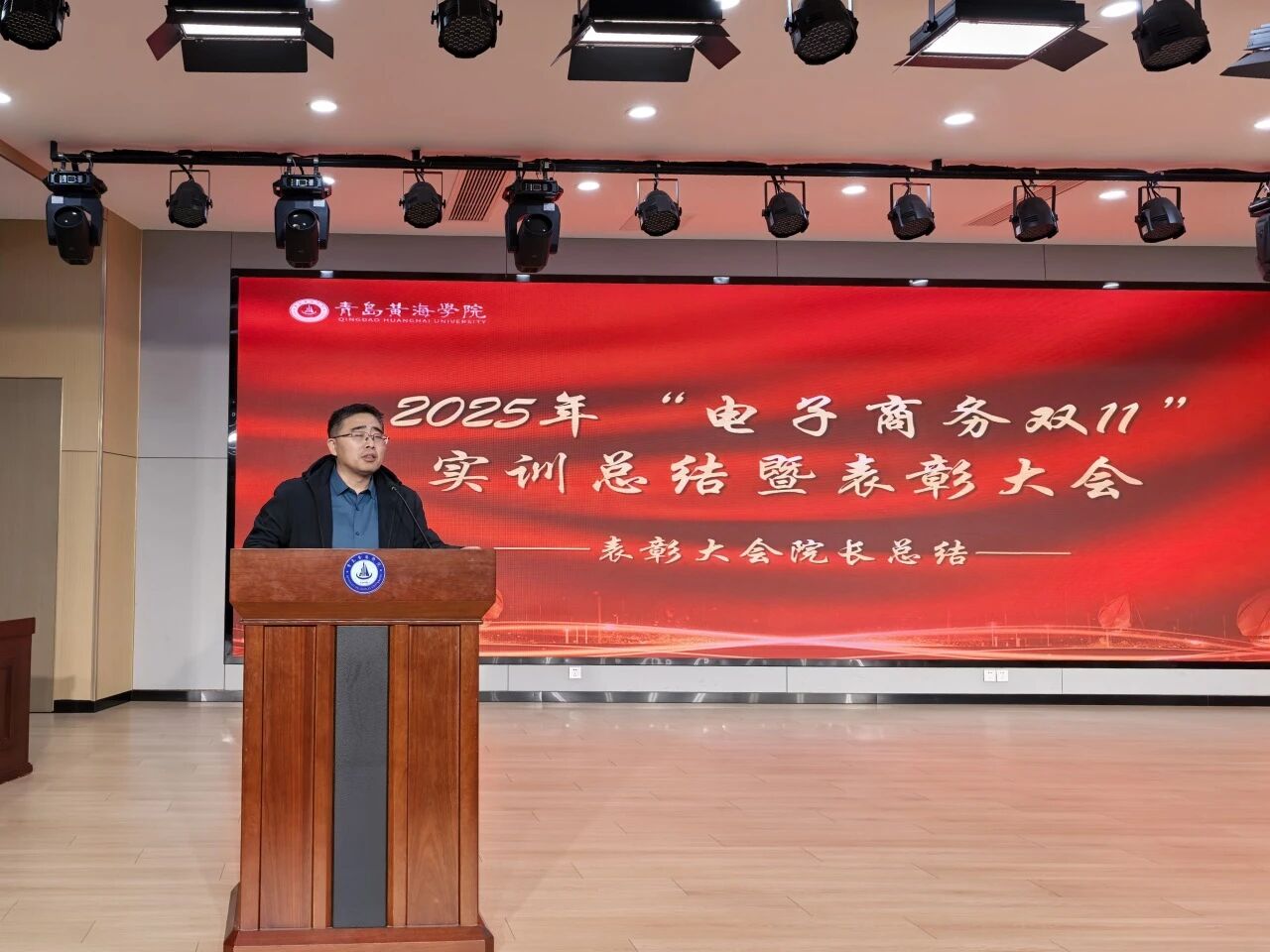 大会最后,应用技术学院院长杨晓磊作总结讲话。他首先对本次双十一电商实训的圆满完成和获奖师生表示热烈祝贺,向鼎力支持实训开展的合作企业、辛勤付出的指导教师致以诚挚的感谢。他指出,本次实训是学院深化产教融合、推进实践育人的一次成功探索,同学们在实战中锤炼了技能、磨砺了意志、收获了成长。他寄语全体学子,要牢记“知行合一”的理念,把实训中积累的经验转化为学习和工作的动力,主动适应电商行业发展趋势,不断提升自身综合素养;同时希望校企双方能够以此次合作为契机,进一步拓宽合作领域、深化合作内涵,共同培养更多高素质应用型电商人才。