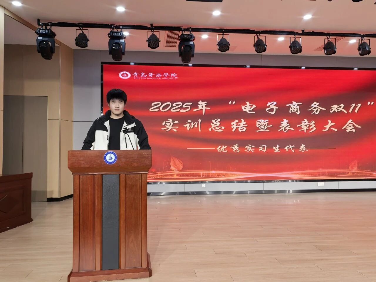 荣誉背后是汗水的浇灌,成长途中有榜样的引领。优秀实习学生代表张博信同学和王晨同学联袂上台发言,二人分别分享了各自的实训收获与成长感悟。张博信同学以添可淘宝授权客服团队实习经历为例,讲述了自己从初入岗位的紧张生疏,到熟练掌握产品参数、沟通技巧,独立处理复杂咨询的蜕变历程;王晨同学则结合直播电商项目实训经验,分享了在直播策划、流量运营、主播协作等工作中的实践心得。他们共同感谢学校与企业提供的实践机会,感恩带教老师的悉心指导与团队伙伴的支持帮助,并表示将珍惜这份荣誉,把实训中的所学所悟转化为前行动力,在未来的学习与工作中再接再厉、再创佳绩。