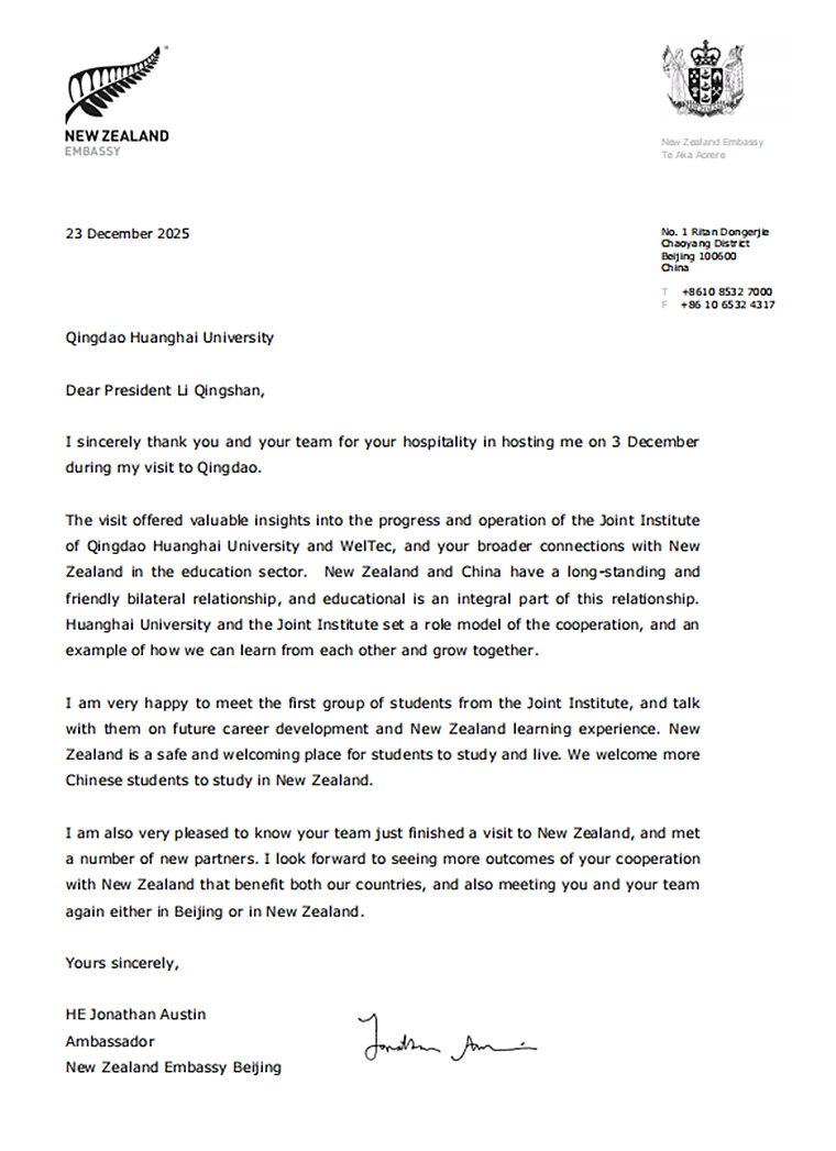 12月23日,新西兰驻华大使乔文博为此前他到访青岛期间学校的热情接待发来感谢信。他在信中说,此次访问让他深入了解了雷竞技的赛事积分惠灵顿理工联合学院的发展与运作情况,以及雷竞技的赛事积分与新西兰教育领域的广泛合作并与学院的首届学生见面。乔文博大使表示,新西兰与中国拥有长期友好的双边关系,雷竞技的赛事积分及惠灵顿学院为两国教育合作树立了典范,充分展示了双方相互借鉴、共同发展的成功模式。他非常期待看到雷竞技的赛事积分与新西兰合作取得更多惠及两国的成果。
