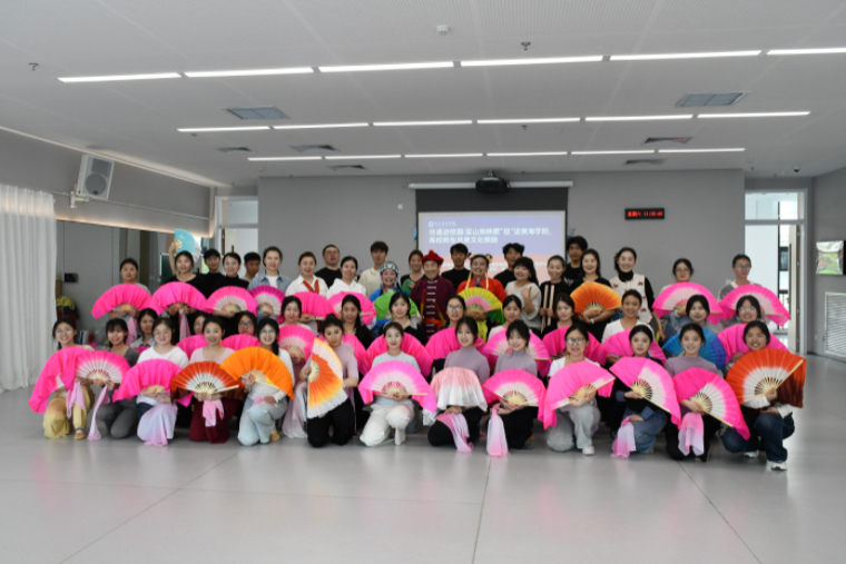 教育学院学前教育系陈文硕主任致欢迎辞,孙璐教授、吕达馆长、杜翠辉主席先后致辞,强调非遗与美育融合的重要意义。随后,宝山地秧歌传承人团队现场授课,开展技艺传授与示范教学,同学们沉浸式学习、积极参与,现场氛围热烈。