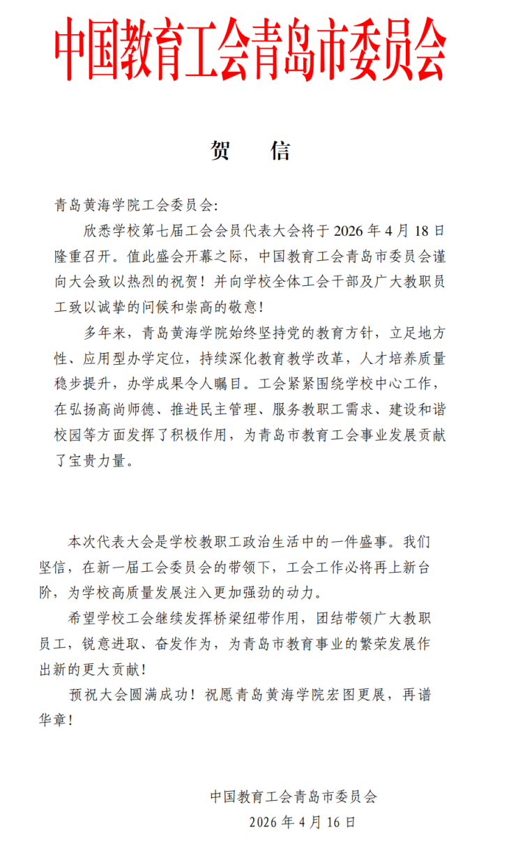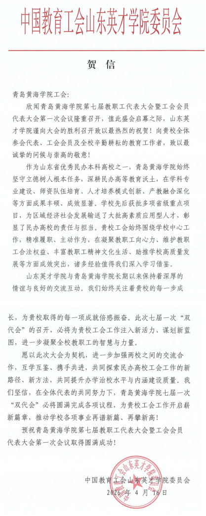 青岛滨海学院贺信