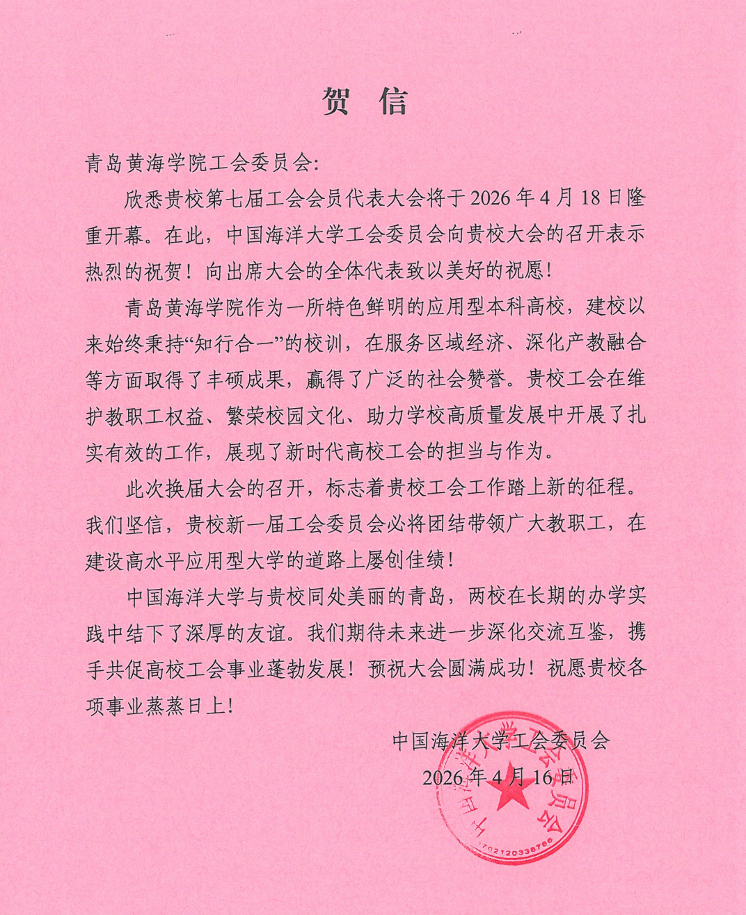 中国海洋大学贺信