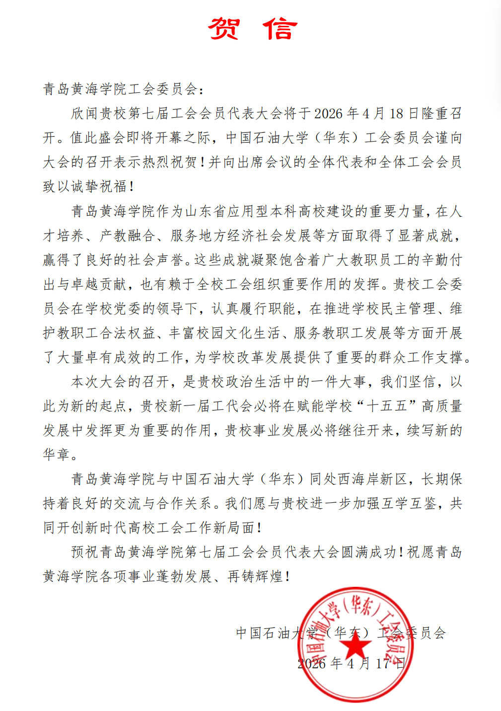 中国石油大学(华东)贺信