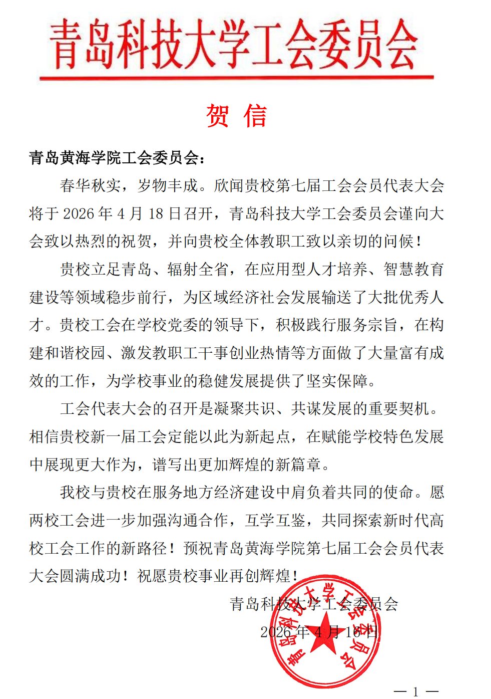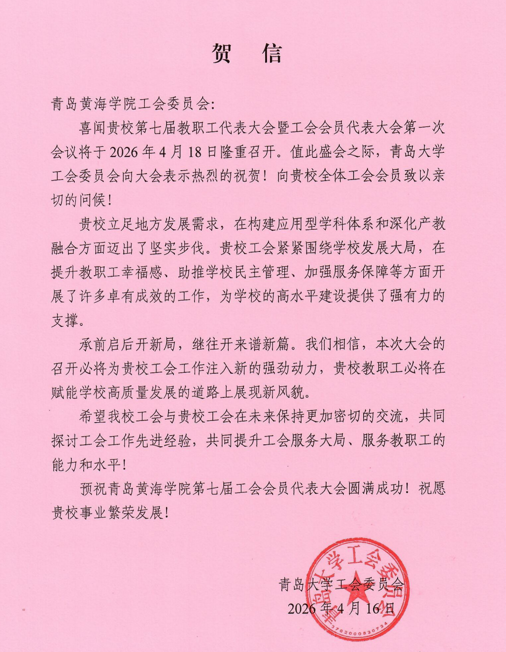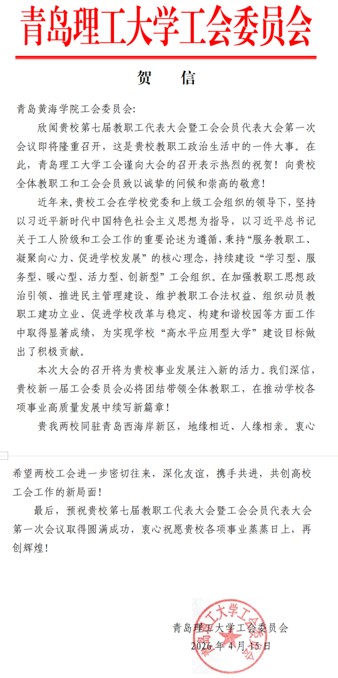 青岛科技大学贺信