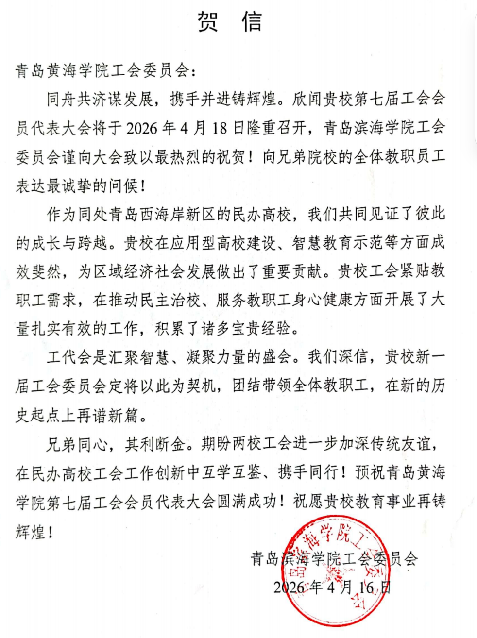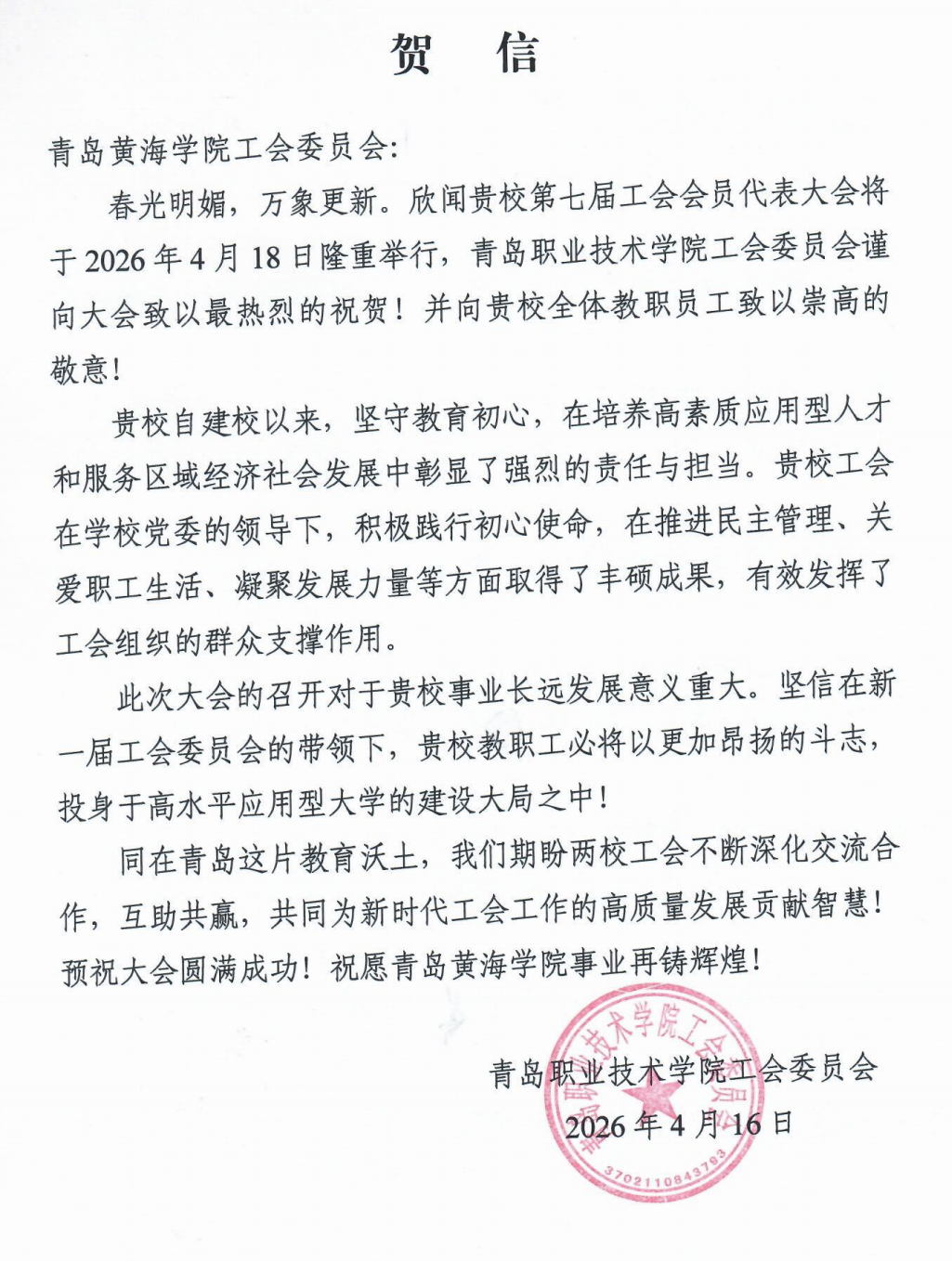 青岛职业技术学院贺信