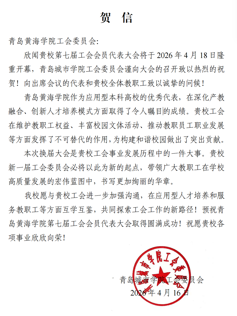 青岛城市学院贺信