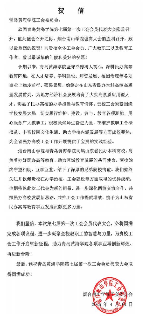 烟台南山学院贺信