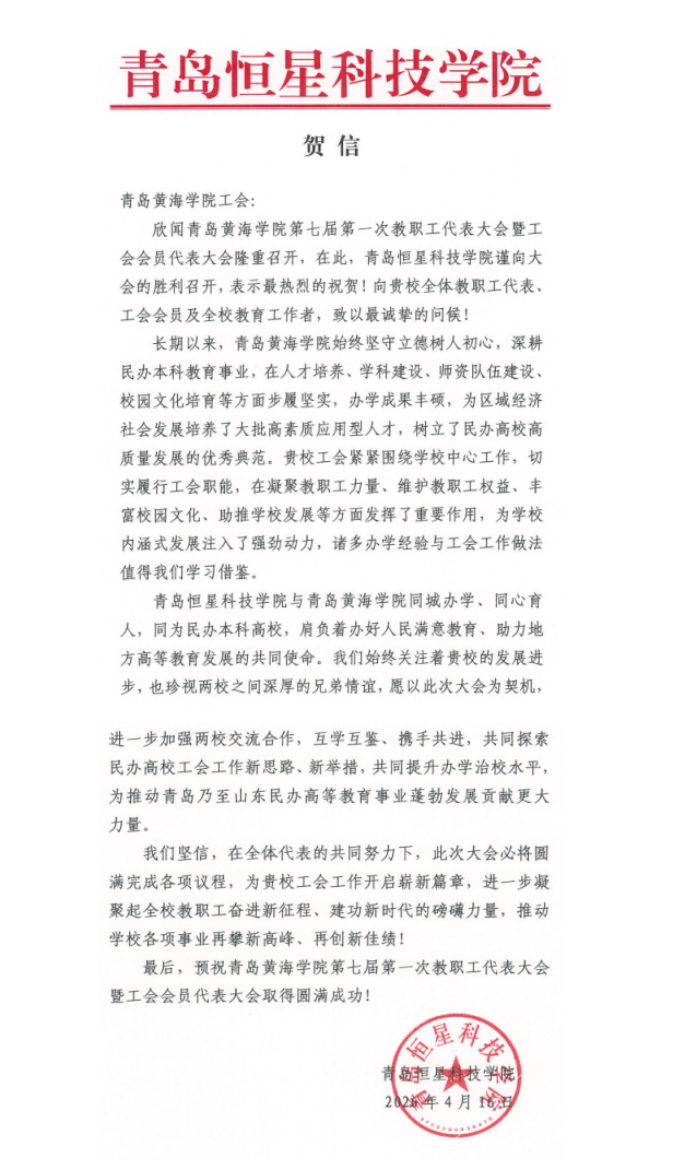 青岛恒星科技学院贺信
