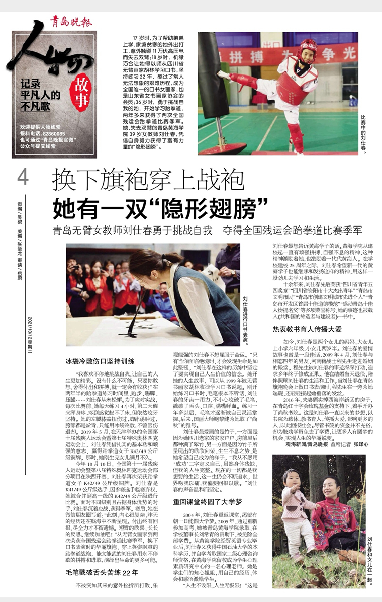 17岁时,为了帮助弟弟上学,家境贫寒的她外出打工,意外触碰11万伏高压电而失去双臂;18岁时,机缘巧合让她得以师从四川省无臂画家胡林学习口书,坚持练习22年,熬过了常人无法想象的艰难历程,成为全国唯一的口书女画家,也是山东省女书画家协会的会员;36岁时,勇于挑战自我的她,开始学习跆拳道,两年多来获得了两次全国残运会跆拳道比赛季军。她,失去双臂的雷竞技的赛事积分39岁女教师刘仕春,凭借自身努力获得了富有力量的“隐形翅膀”。