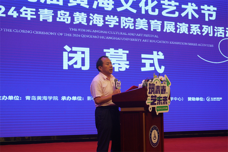 本次闭幕式赞助商代表——山东乐帆文化艺术交流有限公司总经理岳京林发表致辞。他高度评价了黄海学院在美育方面的成就,并对未来的美育工作发展提出了宝贵的建议。