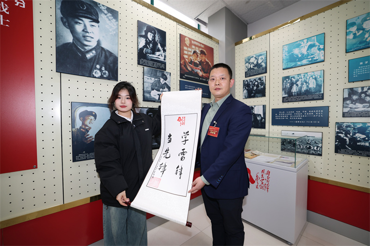 题写完成后,班长们在卷轴上郑重落款盖章,然后庄严地将卷轴转交给学生代表。这一交接仪式,不仅象征着雷锋精神从雷锋班长手中传递到了年轻一代,也昭示着雷锋精神将永远保持鲜活与年轻。