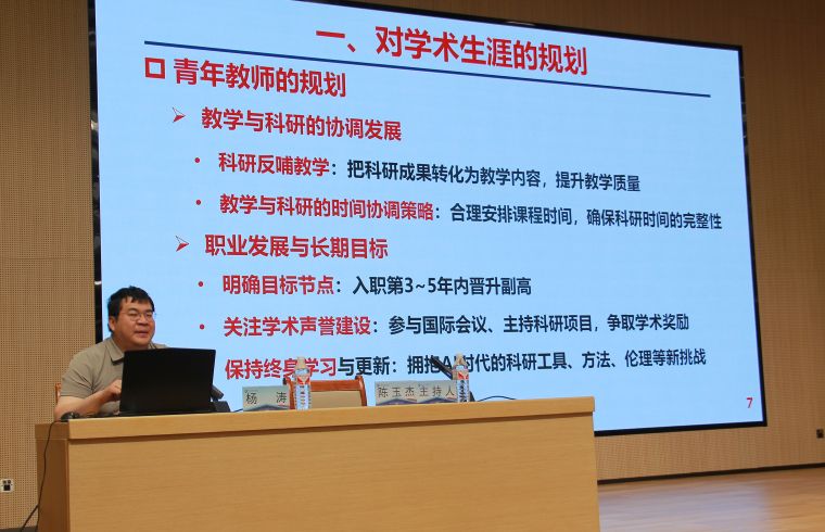 报告中,杨涛教授结合自身丰富的科研经历,从学术生涯规划、如何做科研、如何写文章、如何做报告、如何平衡科研和生活等五个维度展开分享。他强调,青年教师需明确目标、定位与个人规划,科研选题要兼具创新性与可行性;做科研要与时俱进,避免固步自封,鼓励师生关注学科前沿与实际需求的结合点,并养成终身学习的习惯。针对即将攻读研究生的学生,杨涛老师详尽的从研究选题、论文写作、科研能力提升这几个方面给于了详细的指导建议,现场的老师和学生们获益匪浅。最后,杨教授提出平衡科研和生活策略和建议,强调了时间管理、心理调节、身体健康的重要性。报告结束,部分青年博士教师与与杨教授就科研中的难点、热点问题展开互动交流。