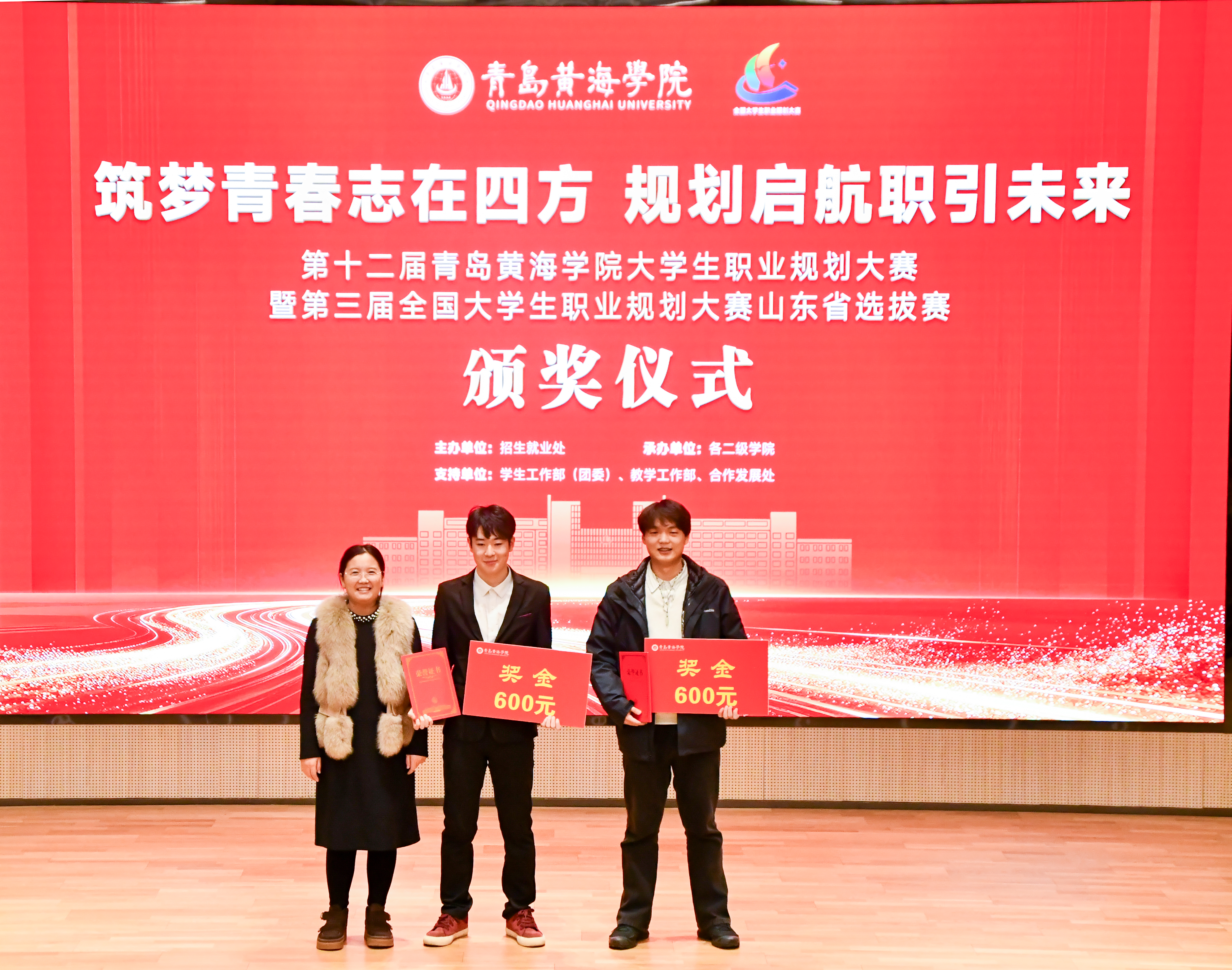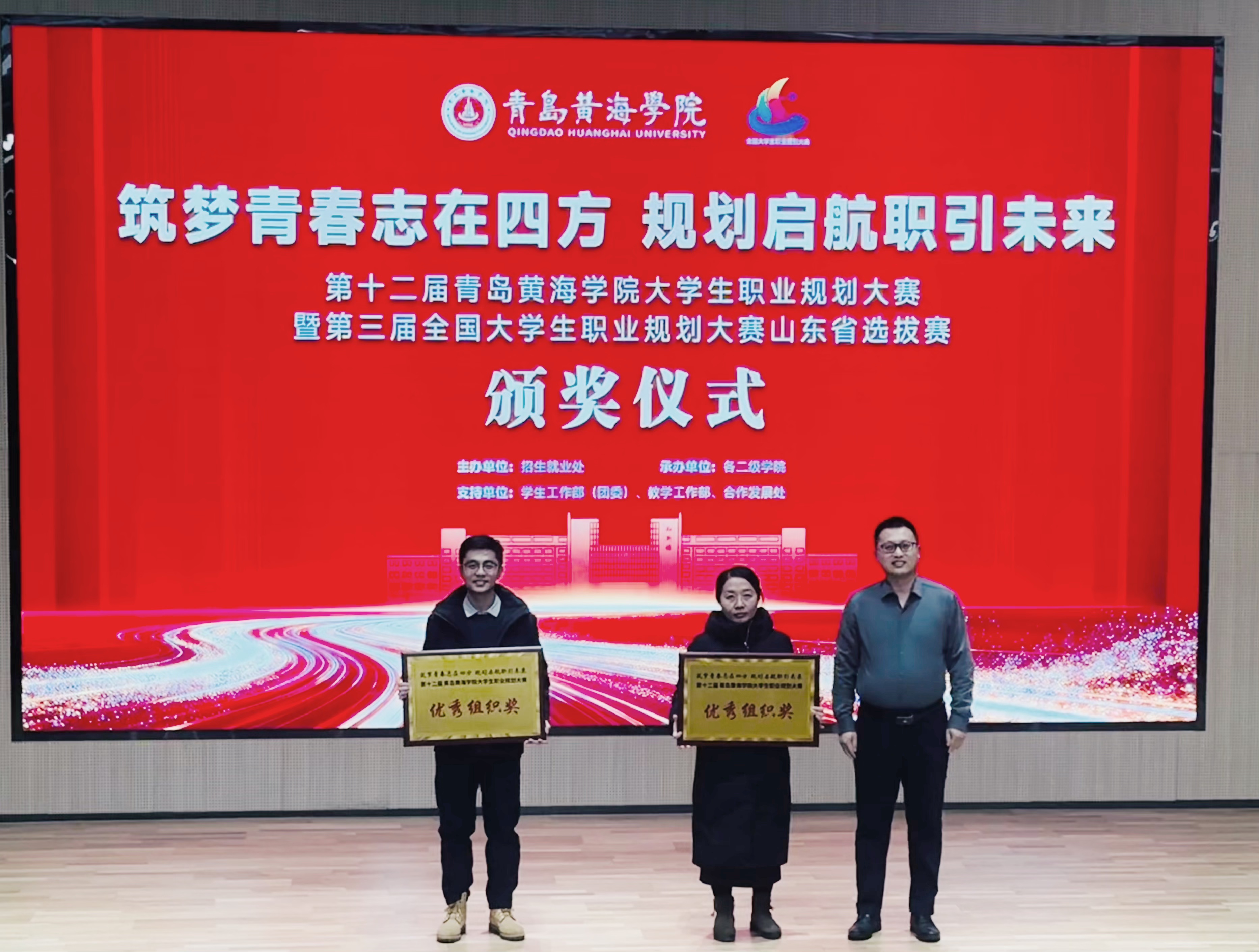本次校级决赛特邀鲁南制药集团人力资源总监宋祥云、青岛大学生涯发展中心主任李莹、青岛海容商用冷链股份有限公司人事总监张云程,以及我校合作发展处处长助理庄伟、继续教育学院院长助理柴建云、招生就业处处长助理张龙洁等校内外专家组成评审团。评审组不仅对选手表现进行了综合评分,更从行业趋势、实践落地及能力提升等方面提出了精准建议。经过激烈的角逐,王增宇获得了就业赛道一等奖,钱学森学院获得本次大赛的优秀组织奖。