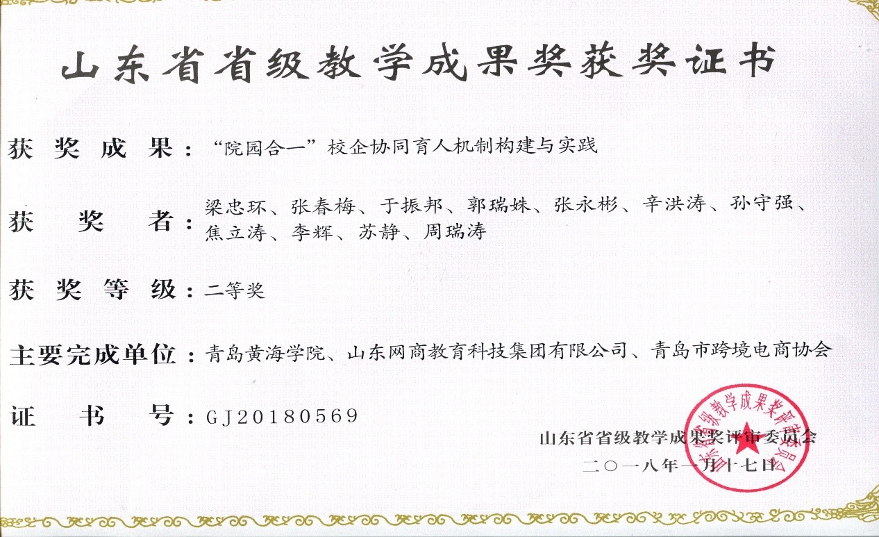 2018年,梁忠环同志主持并带领我院老师共同参与的“‘院园合一’校企协同育人机制构建与实践”与“‘学院+产业园’融合机制下高职电子商务专业现代学徒制改革与实践”荣获山东省省级教学成果奖。