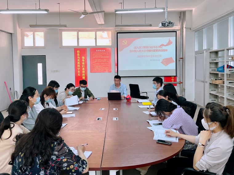 为深入学习贯彻习近平总书记考察中国人民大学重要讲话精神、加快推进学院学思践悟习近平总书记重要讲话精神热潮,国际商学院党总支外语系党支部于5月20日下午在知行楼201召开了学习交流座谈会。会议由外语系党支部书记沈红伟主持,支部全体党员参加。