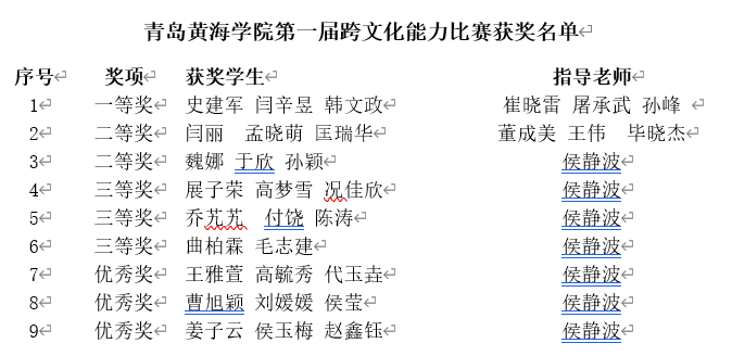 为进一步贯彻落实山东省《加快推进人才国际化若干措施》文件精神、助力山东省高校探索国际化人才培养新模式、营造跨文化教学的良好氛围、增强学生的跨文化能力,“外教社杯”全国高校学生跨文化能力大赛山东赛区青岛黄海学院校园选拔赛胜利举办并圆满结束,共选拔出一等奖一组、二等奖两组、三等奖三组、优秀奖三组。