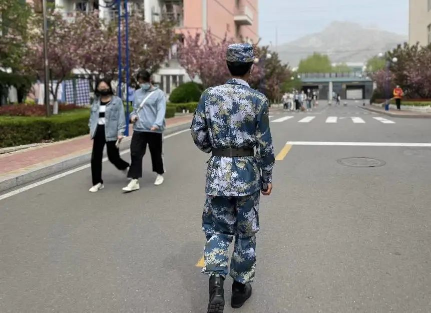 他们站着挺拔的军姿,他们不厌其烦,用洪亮的声音,提醒着来往的同学,“保持一米间距”,“戴好口罩”