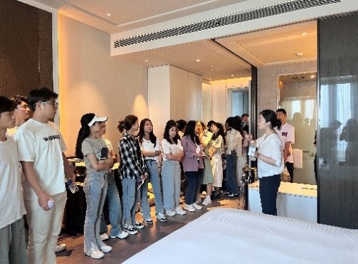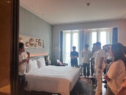 在青岛融创施柏阁,酒店人力资源部门经理带学生参观了客房部,并在过程中详细介绍房间设施,耐心讲解满足不同宾客多样化需求的方法路径。“客房是宾客在酒店逗留时间最长的空间,是酒店的存在基础,客房服务质量决定着宾客的居住体验,直接影响着外界对酒店的价值评判。因此,客房的清洁卫生是否到位,装饰布置是否美观宜人,设备与物品是否齐全完好,服务人员的服务态度是否热情周到,服务项目是否周全丰富等因素至关重要。”通过观听讲解,同学们对客房部的地位作用有了更清晰具体的认知。