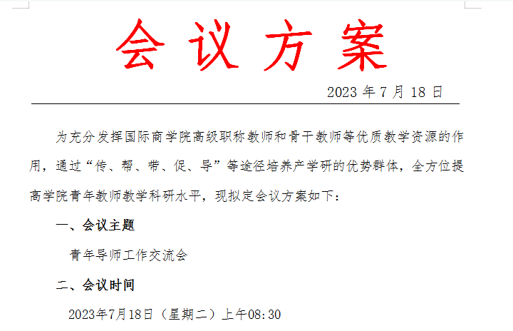 夏条绿已密,桃李芬芳时。新教师作为青年教师中的新群体,是学院新的教科研力量。为充分发挥国际商学院高级职称教师和骨干教师等优质教学资源的作用,通过“传、帮、带、促、导”等途径培养产学研的优势群体,全方位提高我院青年教师教学科研水平,2023年7月18日,国际商学院召开青年导师工作交流会。国际商学院院长王志宪,常务副院长孙在福,院长助理王瑞峰、办公室主任王佳璇及38名青年教师和青年教师导师共同参会。