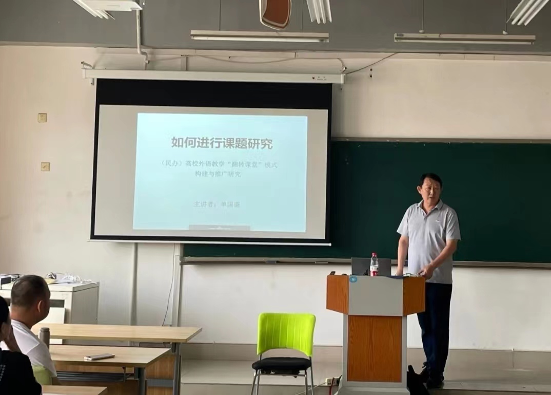 单教授以“(民办)高校外语教学‘翻转课堂’模式构建与推广研究”为题,介绍高校教师如何进行课题研究。高校教师的科研可遵循以下步骤进行:教育科学规划课题、课题研究的价值、课题研究的过程、选题的基本原则、选题的标准、问题的来源、选题中应当注意的问题、课题名称结构、选题的论证、一般结题报告的结构、科研成果推广的意义、课题成果推广方式。单教授结合自己教学过程中的实际案例解释科研过程的每一步应该如何实施,并如何能使自己的科研有效果、有意义。