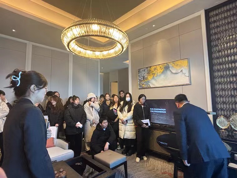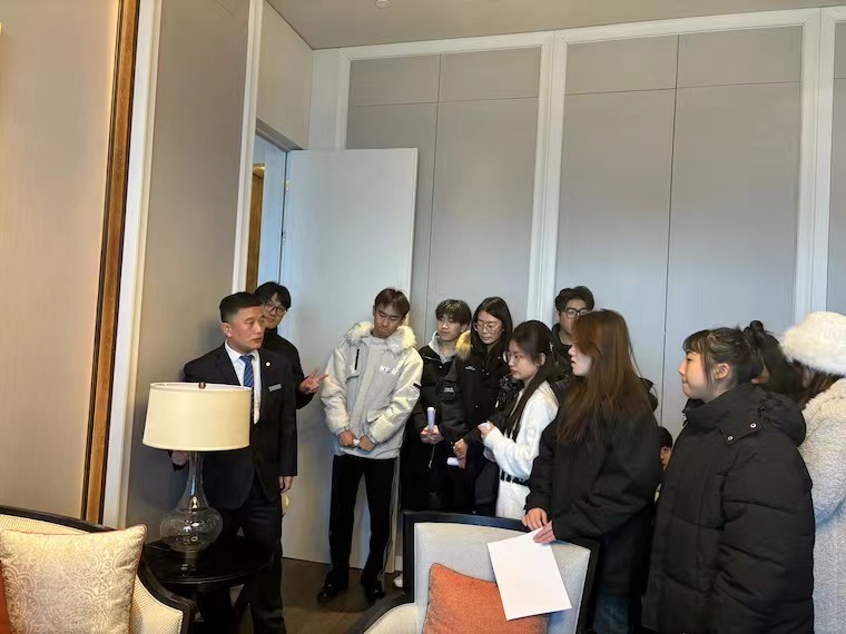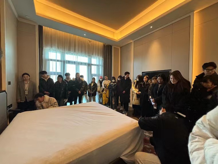 由青岛融创施柏阁酒店培训经理朱茜带领,行政管家(客房部负责人)张作伟结合经验,对同学们开展酒店查房流程、技巧与要领的培训,旨在提升学生对客房细节的把控能力。