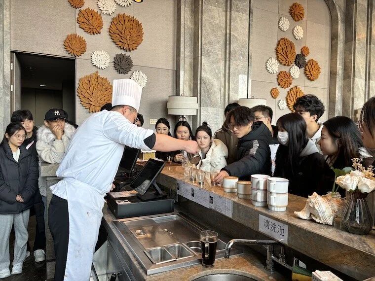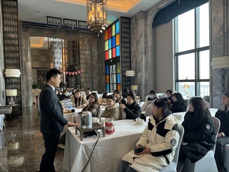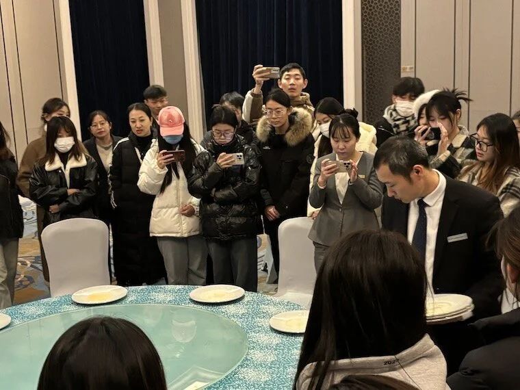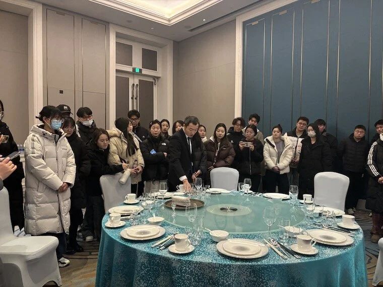 青岛融创施柏阁酒店宴会副经理陈奉祥为同学们进行了深入的酒店中餐服务技能培训。内容涵盖了服务流程的细致讲解、对宴会场合礼仪的规范要求、点菜推荐的技巧以及如何应对客人提出的特殊需求。陈奉祥通过生动的案例分析和实际操作演示,使同学们对中餐服务流程有了更为深入的理解。