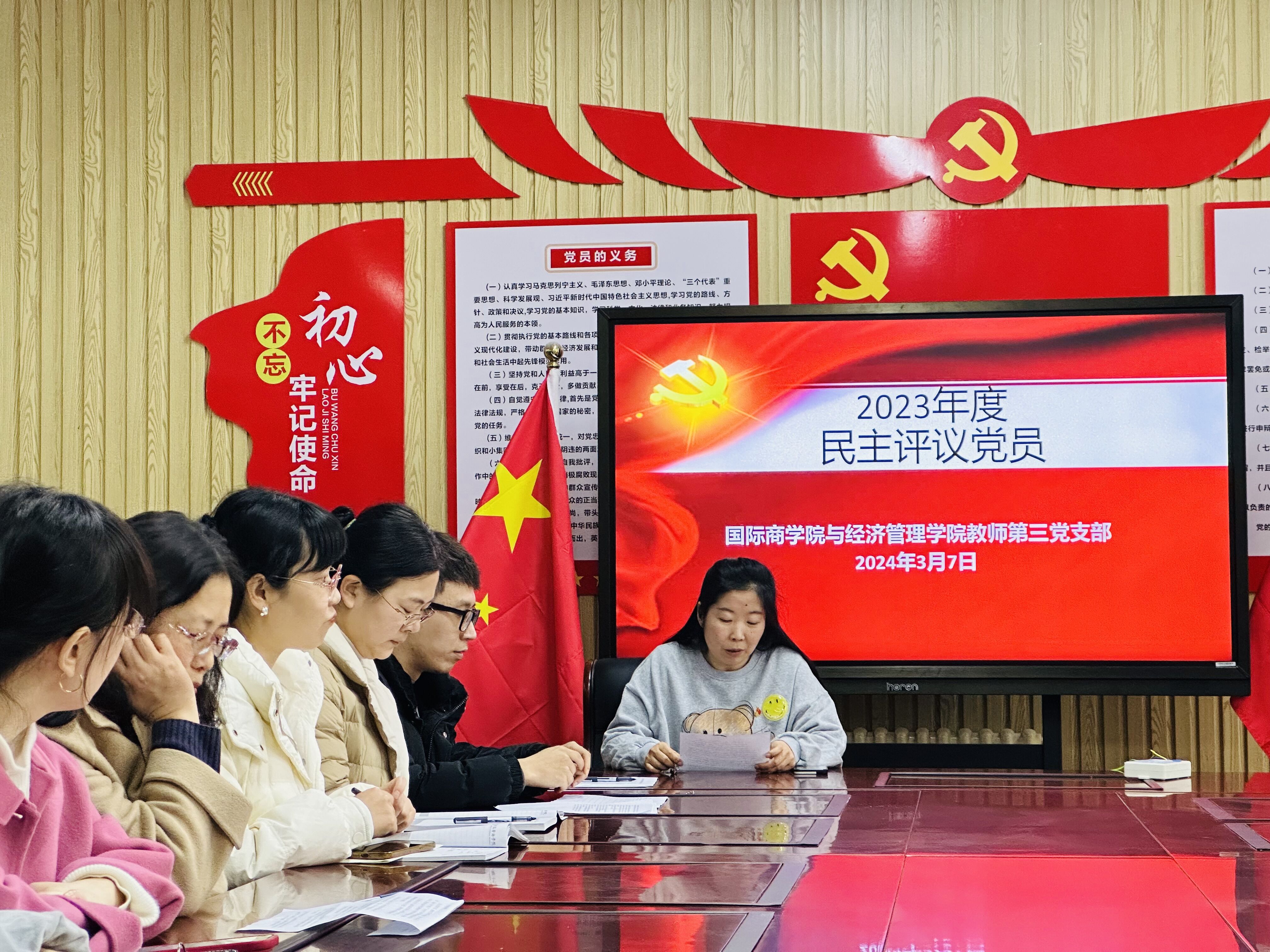 为深入学习贯彻党的二十大精神,增进党支部凝聚力、战斗力,2024年3月7日下午16时,国际商学院与经济管理学院教师第三党支部在知城楼214会议室开展了党支部组织生活会和民主评议党员大会。本次会议由党支部书记孙伶莉主持,全体党员出席会议。