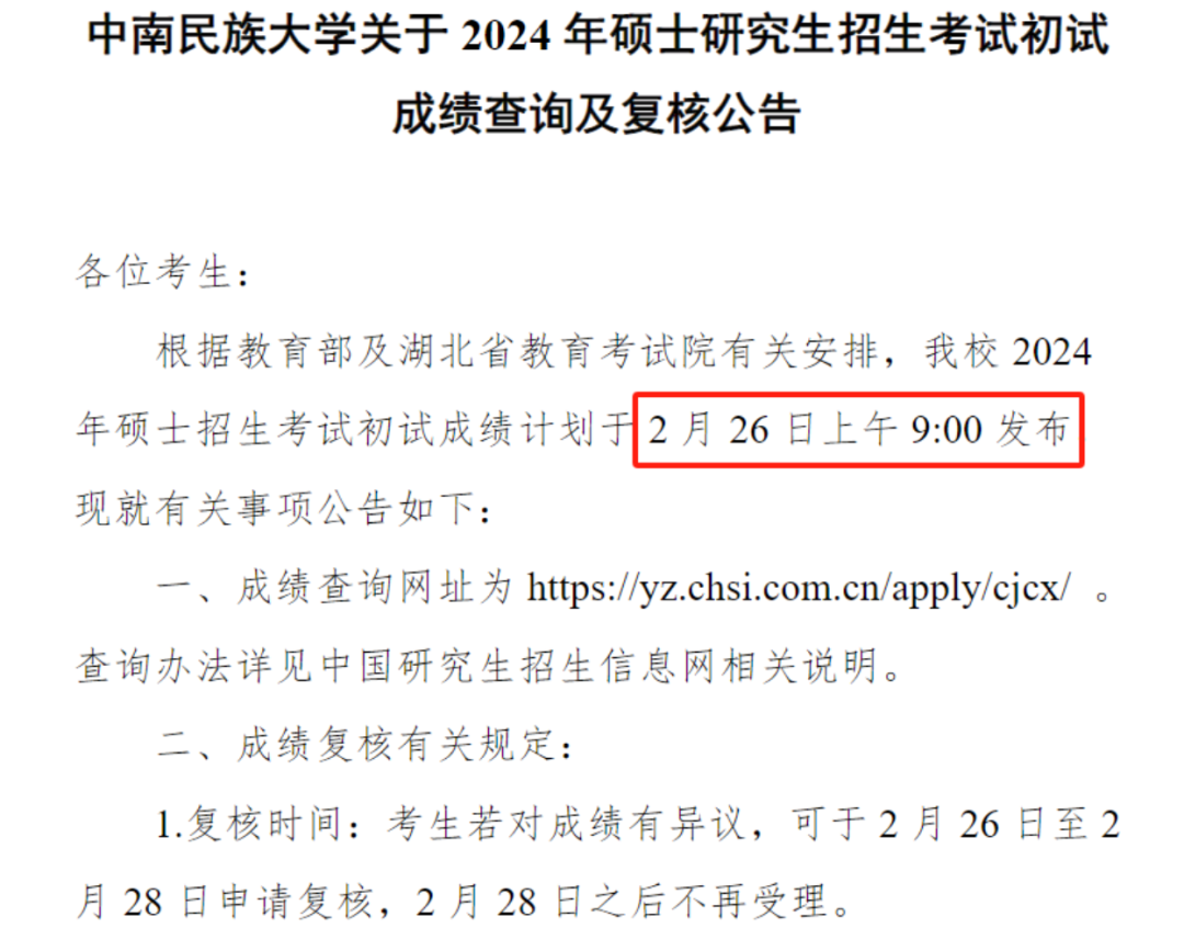 云南大学:初试成绩预计将于2024年2月中下旬公布。
