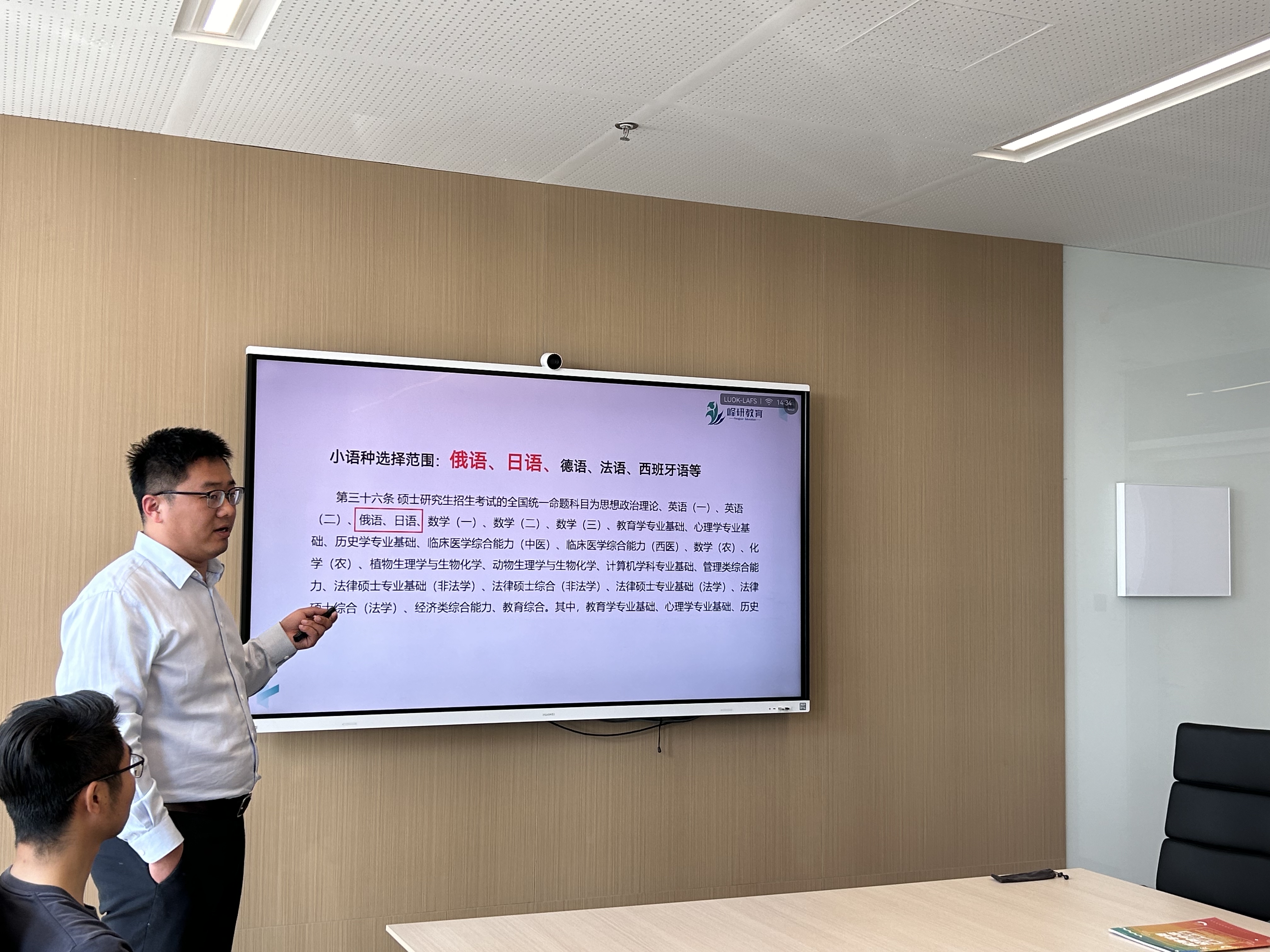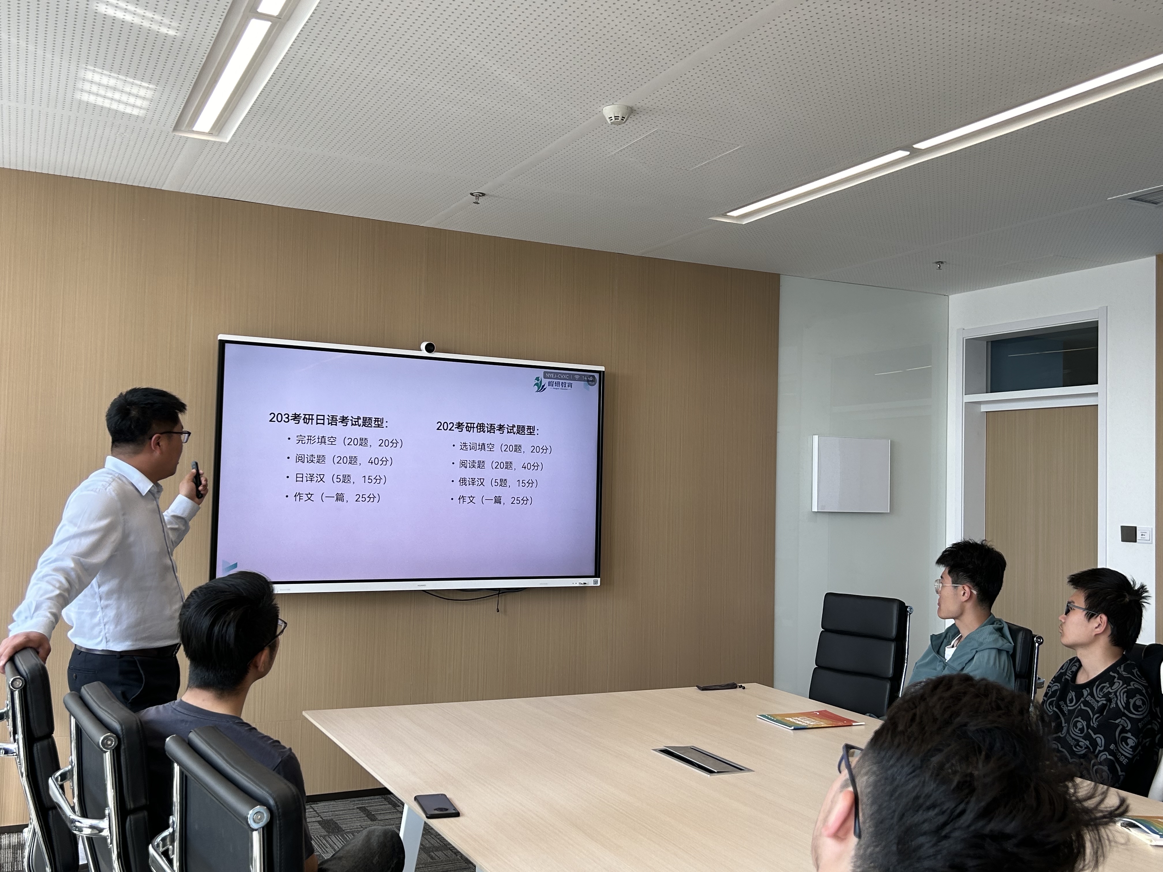 为更好地帮助小语种同学明确考研方向,本次指导会还邀请了峰研教育的李老师作考研方法指导及经验分享,李老师首先向大家讲解了考研的优势和重要性以及当今市场对研究生的需求;其次对我院小语种学生专业特点进行分析,围绕考研最新形式、考研常识、专业院校选择、考试科目及高效备考计划等方面对研究生考试备考进行了深入剖析和讲解;最后为同学们详细分析了近几年小语种的命题科目、考研日语和考研俄语的题型范围,并提出了针对性的备考策略。同时,他也对同学们在备考过程中遇到的问题进行了耐心的解答和指导。
